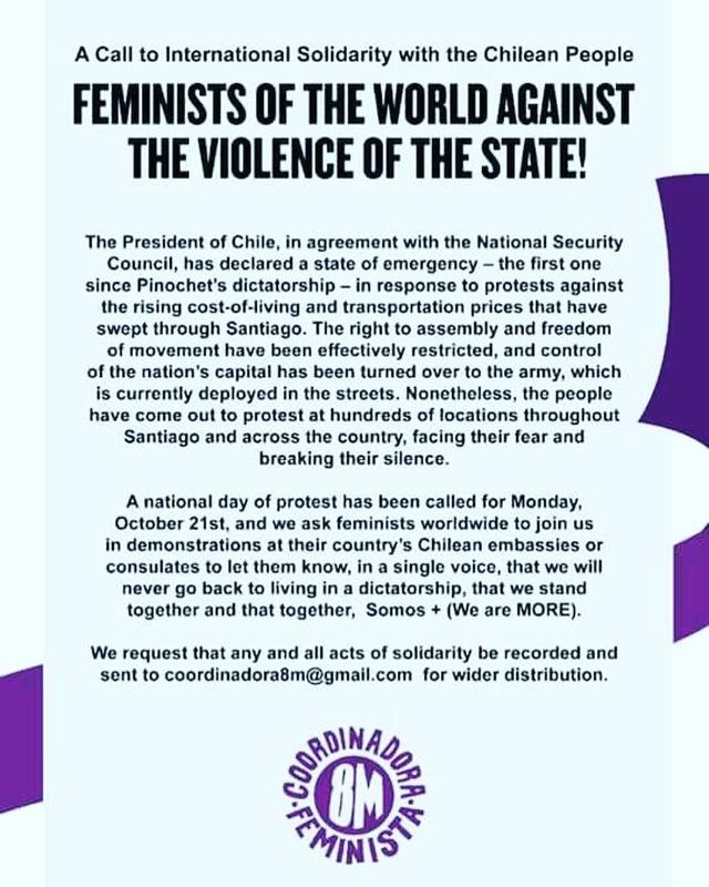 Solidarity with the Chilean people as they move toward a generalstrike today. The coordinadorafeminista8m has called for international solidarity from feminists worldwide! Arriba lxs que luchan!