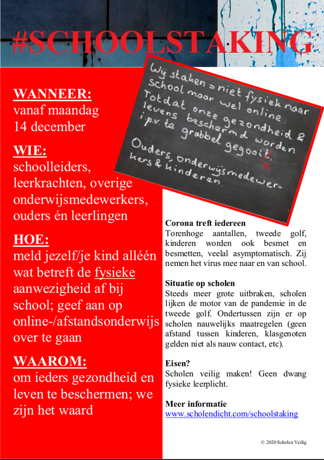 Een schoolstaking waarbij onderwijsmedewerkers, ouders en kinderen zich samen verenigen. Samen op een manier waarbij iedereen bij voorkeur voldoet aan de leerplicht en aan het werk blijft, maar geen onnodig en groot risico meer loopt in de onveilige fysieke schoolsituatie.