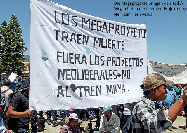 Infrastruktuur projekten betekenen vooruitgang en ontwikkeling, zo die officiële uitleg. Zo schijnt het trein- en autobaanprojekt "tren maya" enkel op het eerste zicht een onschuldig projekt van de mexikaanse regering: op de meer dan 1500 km (van Palenque tot Cancún) zal de route vijf provincies (Chiapas, Tabasco, Campeche, Yucatan und Quintana Roo) verbinden. Politiek en industrie beloven werkplaatsen, een stijging van het tourisme en een opweg naar moderniteit. In werkelijkheid betekent dit projekt de vernietiging van de laatste oerwouden van Zuid-Mexico, negeren van de rechten van de inheemse bevolking, landonteigeningen en verjagen van de lokale bevolking door extra militarisering in een van de meest door conflicten geteisterde regio's van het land. Aan de andere kant, hopen een paar mensen op grote winsten en zetten, zonder terughoudendheid, de realisatie van de "Tren Maya" door.