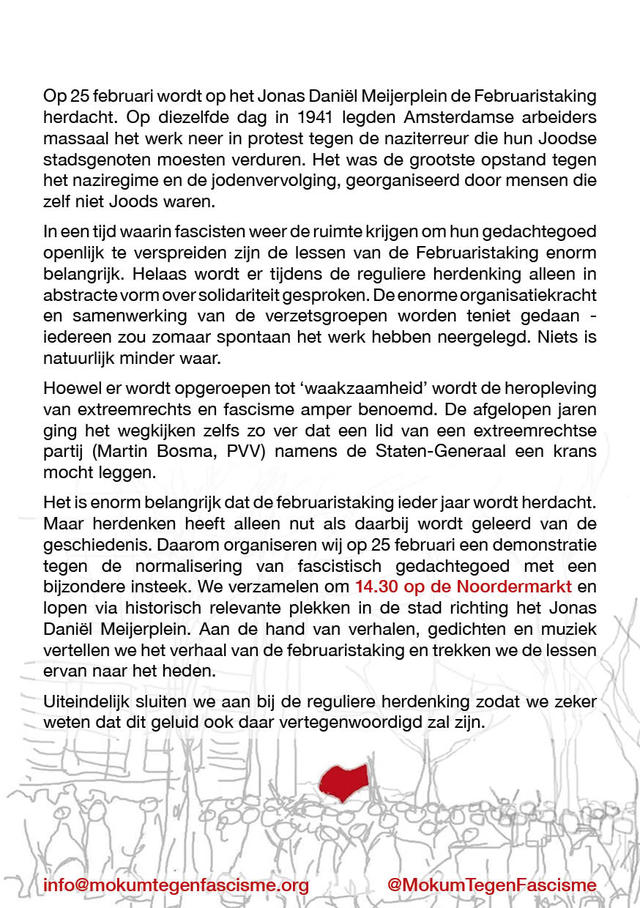 Aanstaande zaterdag organiseert Mokum Tegen Fascisme een demonstratie in vorm van een wandeltocht rondom de herdenking van de februaristaking.