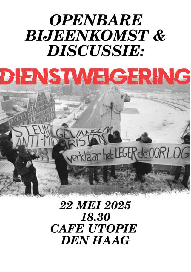 Last February, the The Hague Anti-Militaristic Initiative held a well attended meeting about conscription. During the meeting different perspectives, critiques and analyses on the military service were shared. But what if the situation would evolve further than critique alone? What would a possible refusal of service look like and how could it be organized? We will talk about this during the next discussion evening on the 22nd of May 2025 in Café Utopie in The Hague.