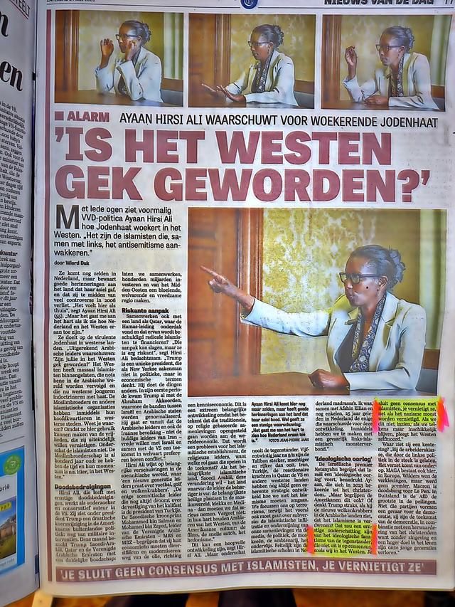 In het artikel met de kop 'Is het westen gek geworden?' zegt zij onder meer beschuldigend: 'Het zijn islamisten die, samen met links, het antisemitisme aanwakkeren'. Hirsi Ali geeft geen details van de 'vernietiging' die zij wenst.