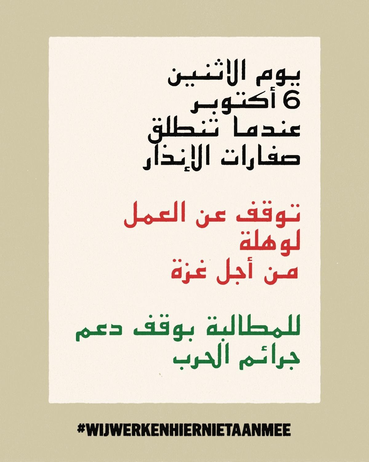 Leg je werk tijdelijk neer voor Gaza. Om te eisen dat de steun aan oorlogsmisdaden stopt. Wij werken hier niet aan mee.