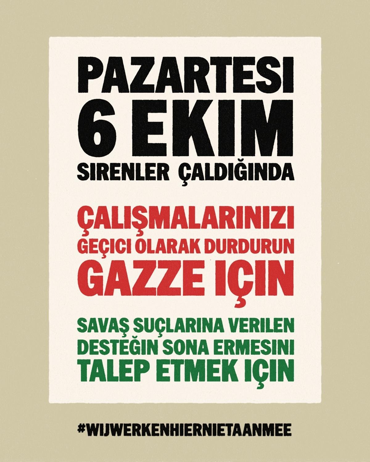 - Are you unable to join this action but do you support our message? Then post the hourglass graphic on social media at noon, out of solidarity with the Palestinians in Gaza. Again under the hashtag: #wijwerkenhiernietaanmee.