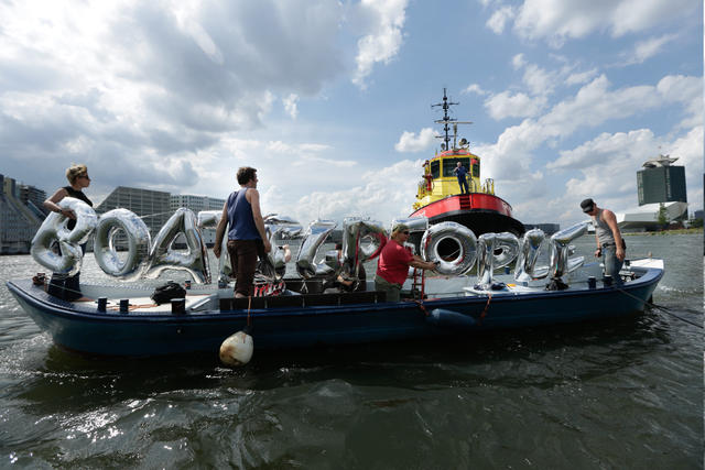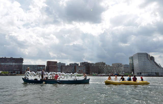 Er zijn in een paar uur goed duizend flyers uitgedeeld, waarin de rol van EU agentschap Frontex wordt uitgelicht. Dankzij het mooi weer en het NDSM festival was het druk op de pont. Een kleine flotilla met spandoeken en de ballonenletters “Boats4people” voer langs de pont terwijl de flyer werd uitgedeeld. Mensen namen de tijd om de flyer goed door te lezen en af en toe een gesprek aan te gaan over deze problematiek. De reacties waren overwegend positief en solidair. Het enige min was een havendienst-boot die ons sommeerde om niet met de flotilla in het IJ te varen, vanwege een afreizende, gigantische cruiseschip. Er kon nog net op een veilige afstand naar gezwaaid worden.