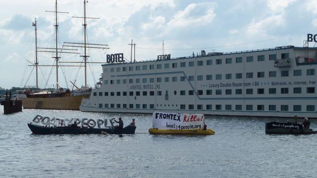 Vandaag is een twintigtal mensen in het IJ in Amsterdam gaan varen in opgetuigde bootjes met spandoeken en ballonnen in de vorm van “Boats4people”. Tegelijkertijd werd op verschillende pontjes een flyer uitgedeeld met informatie over Frontex en Boats4people.