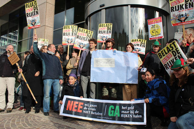 Bij het amstelgebouw in Amsterdam, waar ruim 2000 brievenbusbedrijven zijn gevestigd, hebben een veertigtal activisten geprotesteerd tegen deze grootschalige vorm van belastingontduiking.. Met een reuze enveloppe van de belastingdienst onder de arm kwamen actievoerders de vele miljarden innen om symbolisch aan te tonen dat de bezuinigingen niet onvermijdelijk zijn zolang het geld maar geplukt wordt bij de rijken..