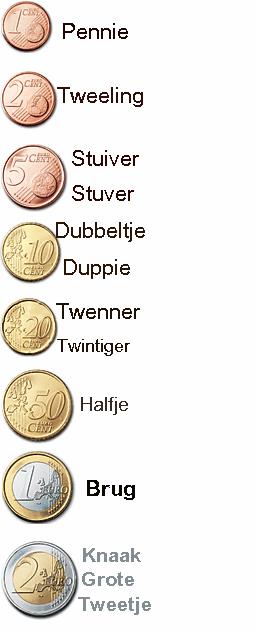 Punt 1: De overheid heeft geen koosnaampjes bedacht voor die munten, en ik weet ook niets van een wedstrijd. Ik verveelde me gewoon en toen heb ik eens namen bedacht. Punt 2: Dat zakje euromuntjes dat jij gratis krijgt en ik niet omdat ik niet in Nederland woon, kun je beter meenemen naar Belgie als je naar de betoging in Brussel gaat. Hier is onderling afgesproken dat, ondanx dat het eigenlijk tegen de wet is (wat eigenlijk een meespelende reden is waarom we dat doen), we toch euromuntjes gaan accepteren tijdens die betoging zodat jij niet onnodig geld hoeft te wisselen in Belgische franken, want daar wordt alleen het wisselkantoor rijk van en twee weken na die betoging zou jij anders nog met dan inmiddels nutteloos geworden muntjes van 1, 5 en 20 frank zitten die je nergens meer kwijtraakt. Neem dus gewoon dat gratis geld mee, en koop er nog een eurosetje bij, dan heb je geld waar je mee kan betalen in Brussel en wat je over houd kun je na twee weken ook in eigen land gebruiken. Die euro komt er toch wel, of je nu hoog of laag springt. Die overgang naar de euro kun je jezelf heel moeilijk maken, maar uiteindelijk heb je alleen jezelf ermee. Er zijn meerdere manieren om met die euro te spotten, dan domweg niet gebruiken en na drie weken erachter komen dat jouw guldens nergens meer geaccepteerd worden. | | euromuntjes in Brussel? | frank - 06.12.2001 00:00