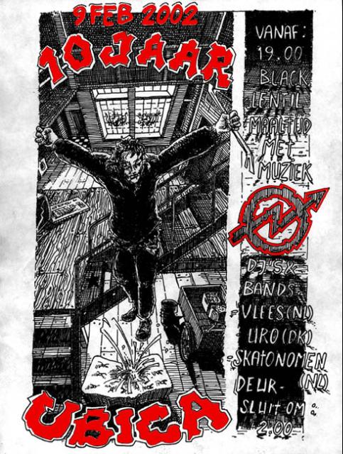 Kraakpand UBICA in hartje centrum Utrecht bestaat deze week 10 jaar! Reden voor n feestje.  UBICA (Ganzenmarkt 24, met uitzicht op het stadhuis) werd op 4 februari 1992 gekraakt na een verminkende brand en 2½ leegstand. Met zelfwerkzaamheid is deze voormalige matrassen zaak opnieuw bewoonbaar gemaakt. Sindsdien biedt het naast woonruimte een vrijplaats voor activiteiten die niet winstgevend genoeg zijn om ergens anders een plek te verdienen in Utrecht, ondanks hun onschatbare sociale waarde. Afgedwongen bij de staat en geregeld in de wet blijft kraken tot op de dag van vandaag de enige mogelijkheid om een leegstaand pand bewoonbaar te krijgen. Dit ondanks de schrijnende woningnood in o.a. Utrecht waar nog steeds welig gespeculeerd wordt met leegstaande panden, huurders uitgezogen worden door malafide huisbazen en woningzoekenden misbruikt worden door ´anti-kraak´ bonzen die hen in ruil voor hun rechten zolang op hun pand laten ´passen´. Ons standpunt moge duidelijk zijn: UBICA BLIJFT! KRAKEN GAAT DOOR!! Laatste nieuws omtrent het programma: Skatonomen hebben afgezegd, jammer maar helaas, daarvoor in de plek Trammelant (NL-punk), Straaljager (NL- 2mans Rock n Roll) en The Banana Peel Slippers (D-ska). Inkom 3 E, honden thuis laten AUB |