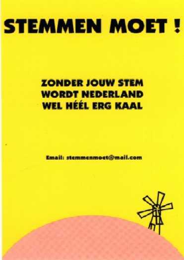 Onder het motto: "STEMMEN MOET! Zonder jouw stem wordt Nederland wel héél erg kaal" start de initiatiefgroep ´stem!´ een landelijke campagne om de allochtonen op 15 mei naar de stembus te krijgen. Per 03 april verspreiden wij via eigen netwerken gratis posters en flyers in de vier grote steden; Den Haag, Amsterdam, Rotterdam en Utrecht. Het gaat om meertalige (Nederlands, Turks en Arabisch) posters. Wij ondersteunen initiatieven van geïnteresseerden door hen te voorzien van posters, flyers en een gratis optreden van een bekende allochtone Nederlander o.a. Najib Amhali (cabaretier), Samira Abbos (journaliste/presentatrice), Mohammed Benzakour (columnist). Daarnaast zullen onze eigen campagne teams gaan flyeren op door allochtonen druk bezochte plaatsen in de vier grote steden.  "Zonder jouw stem wordt Nederland wel heel erg kaal" Vele landgenoten zijn wakker geschud door de verkiezingsuitslag van de gemeente Rotterdam. Het feit dat een grote groep Rotterdammers heeft gestemd op Leefbaar Rotterdam roept verschillende reacties op. Sommige landgenoten voelen zich niet langer welkom in Nederland, anderen zien het als een stap terug op de weg naar een multiculturele samenleving. Iedereen reageert op zijn of haar eigen manier, demonstrerend, organiserend of afwachtend. De initiatiefgroep STEM! is in het leven geroepen om u en uw organisatie te ondersteunen bij uw acties. Wij, een groep jonge allochtonen, hebben posters en flyers ontwikkeld om u te helpen om de vele mensen die geen gebruik hebben gemaakt van hun stem op 6 maart, te motiveren om op 15 mei alsnog te gaan stemmen Wij geloven in de kracht van die massale stem. Als werkelijk alle allochtonen zouden gaan stemmen, dan zou de uitslag van de verkiezingen er heel anders uitzien. Wij kunnen ervoor zorgen dat u gratis folders en flyers krijgt in Nederlands/Turks en Arabisch. Als u een grootschalige bijeenkomst organiseert om uw achterban te motiveren om te gaan stemmen, dan kunnen wij eventueel zorgen voor een bijdrage van bijvoorbeeld Samira Abbos, Najib Amhali of Mohammed Benzakour. De posters en flyers kunt u bestellen via ondervermeld mailadres. Zorg ervoor dat ze overal hangen en dat iedereen naar de stembus komt, want "Zonder jouw stem wordt Nederland wel héél erg kaal". Met vriendelijke groet, De initiatiefgroep STEM! Voor meer informatie: e-mail: stemmenmoet@mail.com E-Mail: stemmenmoet@mail.com |