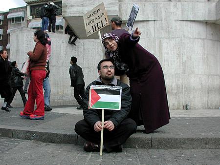 Dear friends , these kind of demonstrations are not helpful for the palestinian people. this is supposed to be a demonstration against violence, and yet it is a violent act in itself - how can it achieve this puropse? there are many ways to demonstrate in way that will be more effective , for example, a march trough the streets with people wearing black as a sighn of mourning for the victims, in complete silence, and as a symbol for the "black flag" that hangs above the actions of isreal. i believe a very important thing to understand is - what of the porpuse of such an act - who is it meant to influence? i think under the current situation actions should be taken with the aim of infuencing the israeli people to stop the occupation - if that is the case, then certainly these kind of actions are not helpful, they seems too much full of hate, too violent. no, this is not the way - the end and the means must be the same - peaceful end can be achieved only by peavceful means