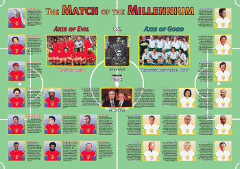 Voetbalposter  Voetbalposter: Evil versus Good Bovenstaande spraakmakende voetbalposter 'Match of the Millennium' (bijlage van Ravage/Extra) tussen de wereldteams 'Axis of Evil' (met o.a. Arafat, Castro, Ocalan, Laden en Khadaffi) en 'Axis of Good' (met o.a. Nixon, Sharon, Blair en Bush) is nu ook te bestellen. 1 poster kost je 3 postzegels van 39 eurocent 2 t/m 5 posters kost je 5 postzegels van 39 eurocent Stuur de zegels van 39 eurocent in een gesloten envelop met je naam en adres en het gewenste aantal aan: Ravage, Van Ostadestraat 233-n, 1073 TN Amsterdam. Wens je een grotere hoeveelheid te ontvangen, bel 020 6761773 of mail