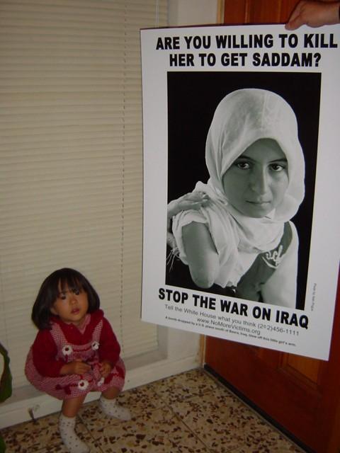The poster features a powerful Alan Pogue photograph of an Iraqi girl who was injured in a US bombing raid south of Basra in April, 1999. Contact us for an editable version so you can create one in another language.