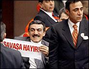 Turkish parliament rejects basing 62,000 U.S. combat troops against Iraq; Turk leader says vote "completely democratic"; US stunned by Turkish parliament's rejection of troop deployment.  "No to war!" sign Saturday before a debate in the Turkish Parliament ISTANBUL and WASHINGTON -- In a serious blow to U.S. plans for a possible war with Iraq, Turkey's parliament speaker nullified the legislature's vote Saturday to allow deployment of 62,000 U.S. combat troops to open a northern front against Iraq. Speaker Bulent Arinc voided the vote on constitutional grounds, ruling that a majority of legislators present had not voted in favor. Arinc then closed parliament until Tuesday. The vote was 264-250 with 19 abstentions, four short of a simple majority. Website: http://groups.yahoo.com/group/DeWaarheid/message/1110 |
