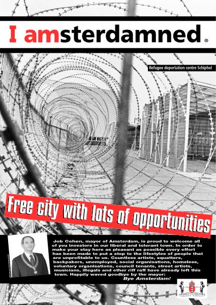 Tijdens de perspresentatie van "I Amsterdamned" in het Foam-museum kreeg wethouder Frits Huffnagel (EZ) het eerste exemplaar van de campagneposter overhandigd, waarmee Amsterdam nieuwe daadkrachtige ondernemingen en nieuwlichting yuppen naar de stad wenst te trekken.  De poster zal de komende maanden op ongezette maar strategisch juist gekozen tijden op muren en achter ramen verspreid worden in de stad. Wie mee wil doen aan deze promocampagne bestelt wat posters via het onderstaande mailadres. Gratis af te halen. Ook mensen woonachtig buiten Amsterdam kunnen de poster bestellen. De text op de poster luidt als volgt: I AMSTERDAMNED Foto: Vluchtelingengevangenis Schiphol-Oost FREE CITY WITH LOTS OF OPPORTUNITIES Job Cohen, mayor of Amsterdam, is proud to welcome all of you investors in our liberal and tolerant town. In order to make your stay here as pleasant as possible every effort has been made to put a stop to the lifestyles of people that are unprofitable to us. Countless artists, squatters, backpakers, unemployed, social organisations, homeless, voluntary organisations, council tenants, street artists, musicians, illegals and other riff raff have already left this town. Happily waved goodbye by the mayor: Bye Amsterdam! Meer info: http://www.indymedia.nl/nl/2004/09/21660.shtml E-Mail: ravage Website: http://www.antenna.nl/ravage |