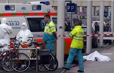 (Ik weet dat het niet mag, maar toch...) Theo van Gogh vermoord 2-11-2004, (filmfocus) - De Nederlandse filmmaker Theo van Gogh (47) is dinsdagochtend 2 november vermoord in Amsterdam Oost. Hij zou zijn neergeschoten en gestoken in de Linnaeusstraat voor het Stadskantoor Oost. De verdachte rende weg richting het Oosterpark, aan de andere kant van het park werd hij gepakt door de politie die al naar hem op zoek was. Hierbij ontstond een schietpartij, waarbij een motoragent gewond raakte. De vermoedelijke dader zou in zijn been zijn geschoten en gearresteerd. Een woordvoerster van de politie in Amsterdam erkent dat een persoon is doodgeschoten, maar wil nog niet zeggen om wie het gaat. Volgens de politie moet de familie van het slachtoffer nog worden ingelicht. Theo van Gogh werd in de jaren tachtig bekend als filmmaker met de boekverfilmingen 'Een dagje naar het strand' (1984) en 'Terug naar Oegstgeest' (1987). Midden jaren negentig had hij succes met '06' en 'Blind Date', twee films die zich concentreerden op de intieme relatie tussen een man en een vrouw. Daarna volgen mindere successen als 'De pijnbank' en de big-budget film 'Baby Blue'. In 2002 komt Van Gogh met de succesvolle tv-serie `Najib en Julia` en een jaar later maakt hij met Katja Schuurman en Pierre Bokma in een paar dagen tijd de film 'Interview' naar een idee van Hans Teeuwen en een script van Theodor Holman. Met 'Cool!' en '06-05' begeeft Van Gogh zich in 2004 op het sociaal-politieke vlak. De eerste film handelt over criminele jongeren in de Glen Mills inrichting, en de tweede gaat over de moord op politicus Pim Fortuyn. '06-05' zou overigens ook de eerste Nederlandse film zijn die zijn première op internet gaat beleven. Samen met politica Ayaan Hirsi Ali maakte hij dit jaar de kunstzinnige provocerende korte film 'Submission Part 1', die uitgezonden werd door de VPRO tijdens het programma 'Zomergasten'. Hierin stonden de te weinig besproken wantoestanden centraal die zich in het leven van sommige moslimvrouwen afspelen. Naast film- en televisiemaker stond Theo van Gogh ook bekend als columnist en schrijver, die nooit een blad voor de mond nam en regelmatig wist te provoceren. (filmfocus.nl, auteursrecht voorbehouden)