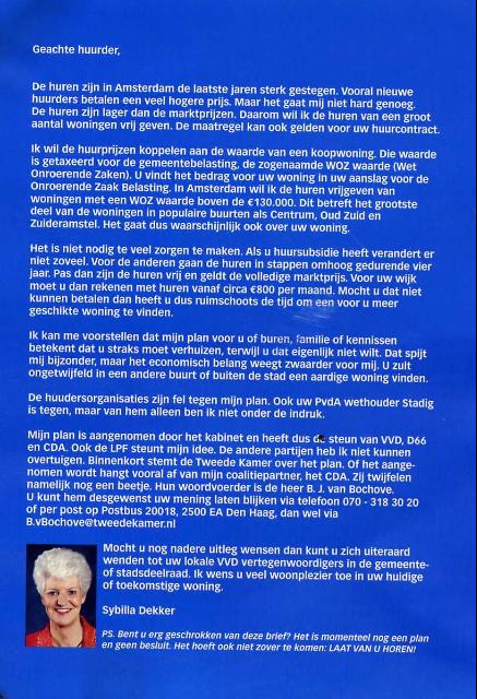 Beste mensen, het gewraakte pamfelt over het huurbeleid van minister Dekker komt van ons. Daar willen we geen doekjes om winden. Wij vonden deze actie hoognodig om de rampzalige plannen de aandacht te geven die zij verdienen. Als huurders er van geschrokken zijn dan spijt ons dat. Maar het is de minister die met haar plannen schrik aanjaagt, wij zijn slechts de boodschapper. De publiciteit is aardig gelukt, gezien oa de artikelen in NRC, Telegraaf, Volkskrant en Parool, en het item op AT5 vandaag en de massa telefoontjes naar de heer Bochove. Zie onderstaand persbericht dat gisteravond verzonden is. Huurdersvereniging de Pijp ************************************** Persbericht, 9 december 2004 Gewraakt pamflet is van ons en de tekst klopt Het is Minister Dekker die huurders laat schrikken Huurdersvereniging de Pijp is de maker van het gewraakte pamflet over het huurbeleid. Daar durven we eerlijk voor uit te komen. De tekst is volledig correct. De voorstellen van minister Dekker raken 3 miljoen huishoudens en zorgen voor een flinke huurstijging bij alle huurders. Ze brengen vele tienduizenden huurders in grote problemen. Ze verpesten het leefklimaat in de populaire stadswijken. Zij zijn daarom volstrekt asociaal, onnederlands en bijzonder slecht doordacht. Het is heel triest dat de minister zich verschuilt achter een stapel vage rapporten en niet voor de gevolgen van haar voorstellen durft uit te komen. Daarom hebben wij gedaan wat zij al lang had moeten doen: hoofdlijnen uit haar voorstel in begrijpelijke taal presenteren aan de huurders zelf. Zodat deze de kans krijgen om tijdig van zich te laten horen, om de Tweede Kamer te overtuigen dat dit plan in de prullenbak hoort. Het enige speculatieve in de tekst is het door ons genoemde bedrag van € 800 per maand. Dat is een voorzichtige inschatting: op de ‘vrije’ markt in Amsterdam is op dit moment vrijwel geen woning te krijgen onder de € 1000 per maand. Kijk naar Londen, Parijs, Dublin of New York, en weet dat betaalbaar wonen in de stad tot het verleden behoort als het aan de minister ligt. Daarmee wil zij een eind maken aan een traditie van sociale huisvesting en betaalbaar wonen. Gelukkig is Nederland nu nog een redelijk sociaal land, waar mensen zekerheid hebben en niet van huis en haar verdreven kunnen worden door winstbeluste huiseigenaren. Daar wil minister Dekker verandering in brengen. Met het huurbeleid dwingt zij mensen die de hoge huren niet kunnen betalen hun huis uit. De minister wil 736.500 * huurwoningen liberaliseren. In 548.000 daarvan wonen mensen die geen huursubsidie ontvangen. Deze mensen krijgen 4 jaar lang extra huurverhoging en dan zijn de huren vrij. Want dat betekent geliberaliseerd: geen wettelijke huurprijsbescherming. De verhuurder kan vragen wat hij wil, en veel particuliere verhuurders maken daar graag gebruik van. Maar ook woningcorporaties zijn lang niet allemaal echt sociaal, zeker in Amsterdam niet. Een kwart van de mensen in deze huizen is 65 jaar of ouder. Ruim 100.000 huishoudens (dus veel meer mensen!) heeft een inkomen onder de huursubsidiegrens maar ontvangt nu vanwege de nog betaalbare huur geen huursubsidie. Straks komen ze daar niet meer voor in aanmerking. Een aanzienlijk deel van hen wordt gedwongen te verhuizen. Nog eens 138.000 huishoudens met een inkomen tussen huursubsidie- en ziekenfondsgrens hangt hetzelfde lot boven het hoofd. De huurders die wij in onze huurkrant als voorbeeld noemen worden keihard getroffen. Ze hebben geen huursubsidie en wonen in populaire wijken. De minister wil de huurprijs voor hun woning over 4 jaar vrijgeven. Ze hebben geen hoog inkomen en mogen van de minister ‘omzien naar een andere woning’, zoals zij stelt in haar huurbrief. Verder pint de minister de mensen met huursubsidie vast aan hun woning. De armoedeval wordt voor deze mensen enorm: als ze meer gaan verdienen lopen ze alsnog het risico hun woning kwijt te raken. Voor de populaire oude stadswijken in Amsterdam zijn de plannen rampzalig. Zij veranderen in ghetto’s voor de rijken, met hier en daar een klein plukje sociale verhuur voor de ‘poor happy few’. Als de minister zegt dat wij onjuiste informatie verspreiden dan bestijden we dat met klem. Het is laf dat de minister zelf niet durft in te staan voor de gevolgen van haar voorstellen. Laat haar dat dan ook gewoon aan de huurders vertellen. Dus mocht de minister haar plan en de gevolgen echt willen uitleggen dan maken we graag samen met haar een folder voor alle huurders in heel Nederland. ************************** * Alle cijfers over aantallen te liberaliseren woningen komen uit een recent onderzoek van het RIGO Research en Advies ‘De rekening voor de huurder. De gevolgen van de modernisering van het huurbeleid voor de ontwikkeling van de woonlasten’ november 2004, pag 12 en 13