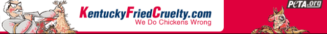 Tussen de streepjes vind je wat Peta liever zou willen. Zij noemen het "realistisch" wij noemen het verloochenen van je principes. animal rights, yes! all the way!! What KFC Needs to Improve Chickens are probably the most abused animals on the planet. They have their sensitive beaks seared off with hot blades and are crammed into tiny cages with the decomposing remains of other birds. Hundreds of thousands are left to starve to death, and huge numbers die as a result of long journeys in extreme weather conditions. Basically, any and all abuse is allowable when it comes to chickens, who are, in fact, remarkable animals with distinct personalities and intelligence that, if allowed to develop, is as advanced as that of cats and dogs. Most importantly, they feel pain, just as we do. The following is a basic outline of PETA’s recommended animal-welfare program: -Adopt the “Animal Care Standards” program. This program creates guidelines to protect chickens on factory farms and covers issues such as ammonia concentration, lighting conditions, and living space in chicken sheds. It also prohibits intentional starvation of breeding birds and states that birds must be provided with mental and physical stimulation. ------------------------------------------ Replace electrical stunning and throat slicing with controlled-atmosphere stunning-to-kill. Experts agree that controlled-atmosphere killing causes much less suffering than KFC’s present method of snapping chickens’ legs into metal shackles and cutting their throats open, often while they are still conscious. -------------------------------------------- Switch to humane mechanized chicken gathering. Studies have shown that using manual methods results in four times as many broken legs, more than eight times as much bruising, and increased stress. Breed for health rather than forcing rapid growth, and stop feeding drugs to chickens. Breed leaner, healthier, less aggressive birds instead of breeding the biggest, fattest birds possible, and stop feeding chickens antibiotics and other drugs for nontherapeutic purposes.