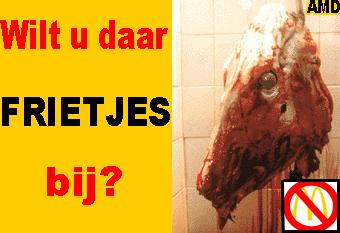 Morgen, vrijdag 14 2005, zal Peta samen met Respect voor dieren Amsterdam een Protestactie houden voor de Kentucky Fried Chicken aan het Damrak te Amsterdam. Iedereen die mee wil demonstreren tegen de wreedheden van KFC is welkom van 11.00u tot 13.00 uur voor de KFC op het Damrak. Komt allen en laten we een halt toeroepen aan deze walgelijke praktijken en commerciele industrie over de rug van onschuldige dieren!  De Kolonels' Geheime Recept Ingrediënten: Kippen (nieuwsgierige, vriendelijke dieren die in sociale groepen leven, nesten bouwen, stofbaden en een sterk ontwikkeld moederinstinct hebben); Wreedheid. Bereidingswijze: Verhonger de ouders en hak hun snavel af met een gloeiend heet mes. Stop hun eieren in een broedmachine tot de kuikentjes uit het ei piepen. Gooi ze met tienduizenden andere kuikens in een grote schuur. NT Voer ze een hoge dosis antibiotica die helpt dat ze zo hard groeien dat ze vaak kreupel worden. Houd ze 6 tot 7 weken in een met uitwerpselen bezaaide schuur en hoop dat ze niet sterven door verstikking, ademhalingsmoeilijkheden of hartaanvallen. Als ze het overleven, grijp ze bij de benen prop met trossen tegelijk in kratten en laad met duizenden op de een vrachtwagen. Rijd ze in de open vrachtwagen in weer en wind naar het abottoir, ook al sterven veel dieren onderweg. Als ze levend het abattoir halen, hang ze dan aan hun dunne benen—die vaak al gebroken zijn—aan de lopende band. Poog hen door een waterbad te laten gaan voor een elektrische schok die hen al dan niet ongevoelig maakt voor de pijn die gaat volgen. Snijd hen de keel door (probeer beide aderen te raken anders sterft het dier niet binnen vier minuten of komt wellicht weer volledig bij bewustzijn). Gooi ze in kokend water om hun veren los te weken; zelfs als ze nog bij bewustzijn zijn of die net weer hebben herwonnen; de smaak wordt hierdoor niet aangetast. Opmerking: Alle kippen voor Kentucky Fried Chicken worden geslacht voor ze twee maanden oud zijn, terwijl gewone kippen een leeftijd van over de tien jaar kunnen bereiken. Help ons door Kentucky Fried Chicken aan te moedigen strikte wereldwijd dierenwelzijnseisen te stellen voor de dieren die gedood worden voor verkoop in hun restaurants: Mr. N. Chaudry Directeur KFC Holdings Koninginneweg 11 1217 KP Hilversum Tel.: 035-625 7270 Fax: 035-625 7269 E-Mail: respectvoordieren@mail.com Website: http://www.respectvoordieren.org |