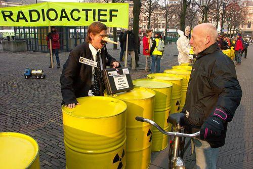 Uit het persbericht (inderdaad, kwam achteraf pas en werd nauwelijks verspreid): "Dit is wat kerncentrale Borssele elke 10 jaar oplevert: 200 vaten hoogradioactief afval dat 240.000 jaar gevaarlijk blijft en waarvoor nog steeds geen oplossing is." Hele persbericht op