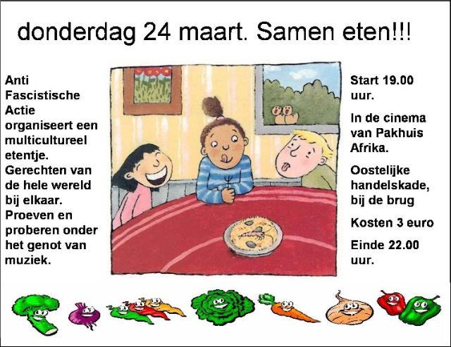 In de week van 21 tot en met 28 april organiseert het platform allemaal anders, allemaal gelijk een actieweek tegen rascisme en intollerantie. Dit breedgedragen platform verzorgt de hele week acties, discussies, fora en als grote afsluiter een grote demo op 28 maart. Kijk voor meer info op www.allemaalgelijk.nl Anti Fascistische Actie Amsterdam organiseert een weekendarrangement met eten, streetrave, voetbaltournooi etc. Zie hieronder de exacte agenda. Voor mensen buiten Amsterdam kunnen slaapplaatsen geregeld worden, voor info: amsterdam@antifa.net     Donderdag 24 maart is er een multicultureel etentje in de cinema van pakhuis Afrika. Onder het genot van muziek kan je proeven van gerechten van over de hele wereld. Start: 19.00 uur Kosten 3 euro Vrijdag 25 maart is er een Streetrave die start op het Musuemplein en door de Pijp naar het oosterpark zal gaan. Komt allen en dans mee voor een wereld voor iedereen. Neem lawaai, muziek en toeters mee of bouw een geluiswagen, alles welkom!! Start: 14.00 mueumplein bij de Albert Heijn Vrijdags 's avonds organiseren marokkaanse jongeren een discussie over wat kunnen jongeren doen tegen racisme. Plan is om daar met z'n allen heen te gaan. Verdere info volgt nog Zaterdag 26 maart organiseren marokkaanse jongeren een voetbaltournooi tegen racisme. Actievoereders doen mee met 2 teams. Kom kijken, aanmoedigen of voetballuh! Van 17.00- 22.00 uur Sporthal de Pijp Zondag 27 maart is er weer traditioneel paasbierzoeken in het Sarphatipark (dit valt buiten de actieweek, maar is leuk ter vermelding) Verzemelen om 15.00 uur in de Molli, van ostadestraat 55 huis Maandag 28 maart is er de grote klapper van de week; een grote demo van de westermarkt naar het westerpark als afsluiter van de week tegen racisme en intollerantie. Start: 13.00 uur Westermarkt Komt Allen!!! E-Mail: amsterdam@antifa.net Website: http://www.allemaalgelijk.nl |