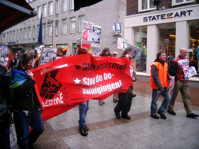 Afgelopen zaterdag 12 maart was er een demonstratie tegen racisme in ’s-Hertogenbosch. De demonstratie vond plaats onder het motto: “Hart tegen verharding: voor een kleurrijk Brabant”.      “PEOPLE, NOT PROFIT: SMASH CAPITALISM!” Afgelopen zaterdag 12 maart was er een demonstratie tegen racisme in ’s-Hertogenbosch. De demonstratie vond plaats onder het motto: “Hart tegen verharding: voor een kleurrijk Brabant”. Offensief was een van de organisatoren van deze demonstratie, maar onze inbreng was duidelijk een accentuering van het verband tussen racisme en bezuinigingen, wat ook tot uitdrukking kwam in de toespraak van mijzelf tijdens de manifestatie. Ook andere organisaties waren aanwezig, waaronder de SP en haar jongerenorganisatie Rood. Door Bas de Ruiter, Offensief Den Bosch Tijdens diezelfde manifestatie sprak ook Anja Meulenbelt, Eerste Kamerlid van de Socialistische Partij over de historische achtergronden van de aanwezigheid van migranten in ons land, de economische redenen voor deze migratie die door de ongelijke welvaartsverdeling in de wereld veroorzaakt worden, racisme en de strijd daartegen. Zij haalde hard uit naar het absurde ‘volksnationalisme’, aangezien het zogenaamde ‘Nederlandse volk’ bestaat uit diverse volkeren die voor het ontstaan van het huidige Nederland al hiernaartoe zijn gekomen. Het comité dat de manifestatie organiseerde legde in haar motto niet duidelijk een verband met het neoliberale bezuinigingsbeleid van het kabinet Balkenende-2. Maar wij van Offensief, die zaterdag duidelijk aanwezig waren met kameraden van onze Belgische zusterorganisatie LSP-MAS, lieten ons er niet van weerhouden om dit verband wel te leggen! Dit blijkt wel uit de leuzen die te horen waren vanuit het blok van onze campagne ‘Offensief tegen racisme en bezuinigingen’. Veel gehoorde leuzen waren: “Bezuinigingen: nee, werkloosheid: nee, armoede: nee, racisme: nee. Wij vechten, wij vechten, wij vechten voor iets beters!” en “People, not profit: smash capitalism!”. Bovendien bleek ook uit ons veelgekleurde spandoek dat in onze visie kapitalisme en racisme onlosmakelijk met elkaar verbonden zijn. Malcolm X zei het al: “You can’t have capitalism without racism”! De demonstratie was in politiek opzicht succesvol. De opkomst bedroeg circa 35 personen, en de sfeer tijdens de demonstratie was enorm strijdvol. We trokken behoorlijk wat aandacht van het winkelende publiek, en hadden nuttige discussies met omstanders. Gelet op onze succesvolle bladverkoop (35 Offensief-kranten werden er verkocht, ook aan omstanders) en de interesse van een aantal mensen om de strijd tegen racisme en bezuinigingen samen met ons willen voeren, is er een groeiende behoefte aan een wereldwijd socialistisch alternatief op het kapitalisme. Alleen zo kan er daadwerkelijk een einde worden gemaakt aan racisme. Na afloop van de demonstratie riepen wij op voor het voortzetten van de strijd tegen racisme en kapitalisme. Kom dus ook naar de openbare bijeenkomst van Offensief tegen racisme en bezuinigingen in Den Bosch: aanstaande woensdag 16 maart om 16.00 uur in café Terminus! Zie ook: