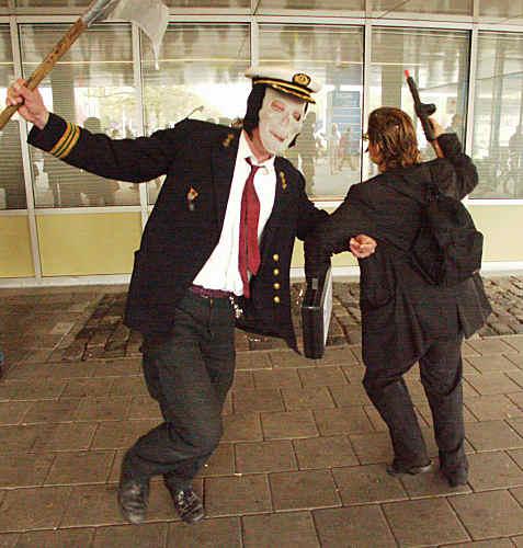 Protestdag ITEC eindigt met schermutselingen Het venijn zat in de staart. Na een educatief en cultureel programma tijdens de manifestatie 'ITEC Vertrek!', gaan vijftig personen over tot blokkade van de weinig stijlvolle entree. Omdat de RAI voor de veiligheid van ITEC een deel van het terrein heeft afgezet met hekwerk, is de wapenbeurs al aardig op een vesting gaan lijken.  Foto: Arjen vd Merwe Een vesting 'belegerd' door een gemeleerd gezelschap van antimilitaristen, pacifisten en 'wapenfabrikanten', zoals de heer 'P.A. Triot, weapon lobbyist'. Na een geslaagde picketline vroeg in de ochtend, waarbij de arriverende wapenhandelaren en militairen konden rekenen op een emotioneel onthaal (lees: we lieten ze spitsroeden lopen), druppelen rond de klok van een uur de betogers binnen voor de manifestatie. Uiteindelijk nemen 125 mensen deel aan het protest, voor een doordeweekse dag zowaar geen slecht resultaat. Er klinkt boegroep als Pauline Buursma-Haitsma van de VVD-Amsterdam zich uitspreekt voor beurzen als ITEC waar volgens haar weinig mis mee is. In elk geval heeft zij de moed getoond om op het podium te gaan staan, hetgeen van Lodewijk Asscher van de PvdA niet gezegd kan worden. Jupijn Haffmans (Amsterdam Anders / De Groenen) en Remine Alberts (SP-Amsterdam) zijn helder in hun commentaar: wapenbeurzen horen niet in Amsterdam en de burgemeester moet zich hier hard voor maken. Rond half drie is het tijd voor de blokkadeactie. Zo'n veertig actievoerders posteren zich voor de opening in het hekwerk, geruggesteund door de muzikale klanken van de folkband Zibabu. Nadat blijkt dat de ITEC bezoekers door agenten naar een zij-ingang worden begeleid, wordt ook deze door vijftien mensen geblokkeerd. Hierdoor raakt een groep agenten in de verdrukking; men kan even geen kant meer uit. Wederom worden de beursgangers naar een andere ingang geloosd, maar ook die wordt al snel geblokkeerd. Althans, daartoe wordt weliswaar een serieuze poging ondernomen, ware het niet dat de politie het nu zat is. Er wordt flink getrekt en geduwd. Personeel van de RAI draagt een steentje bij door fanatiek met een deel van het hekwerk de actievoerders weg te duwen. Betogers weten een arrestatiepoging te verhinderen. Dit is het moment dat de organisatie van het protest ingrijpt en de actievoerders tot kalmte maant. We strijden immers voor een vreedzame wereld. Tegen half vier komt aan de eerste protestdag een eind. Morgen, woensdag 27 april, posteren de tegenstanders zich om 8.30 uur weer voor de ingang van ITEC. Kom ook langs. Indien het ITEC-gezelschap 's avonds ergens in de stad dineert, houden we een kabaalwake voor de deur. Wees paraat! Donderdag 28 april om 15.30 uur wordt het oorlogsgajes vrolijk edoch dwingend uitgezwaaid. Om nooit meer terug te keren, naar we veronderstellen. Website: http://www.antenna.nl/ravage |