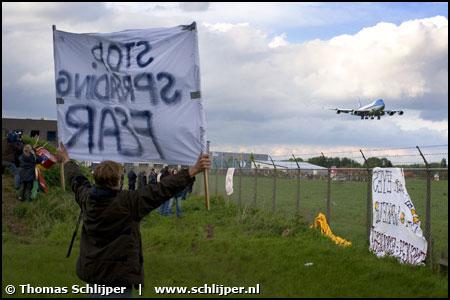 (8 mei 2005 - Bericht van Vredesburo Heerlen) P E R S B E R I C H T Het atoomkoffertje van Bush Maastricht, 8 mei 2005 - Vanochtend is een Burgerinspectie team op zoek gegaan naar het koffertje van Bush met de atoomknop oftewel de atoomcode. Hiermee kan de president altijd het afschieten van atoomwapens bewerkstelligen. De 6 Burgerinspecteurs werden echter bij het prikkeldraad voor het hotel van Bush door militairen aangehouden. Voor het overbrengen naar een politiepost, werden de Burgerinspecteurs door twee sloten getrokken waardoor ze tot hun middel, nat werden. Waarom een Burgerinspectie? Een van de belangrijkste redenen die de Verenigde Staten aanvoerden om een oorlog tegen Irak te beginnen, was de vermeende en nog altijd niet bewezen aanwezigheid van massavernietigingswapens in dat land. Nederland steunde een aanval op Irak zonder VN mandaat. Van Irak werd absolute openheid en ontwapening van massavernietigingswapens ge�ist. Ontwapening dient echter wereldwijd plaats te vinden. Ook op Vliegbasis Volkel liggen atoombommen, naar verluidt liggen er in totaal 20 atoombommen met elk een explosieve kracht die maximaal ongeveer 14 maal zo sterk is als de atoombom op Hiroshima. Atoombommen zijn de meest destructieve massavernietigingswapens ooit ontwikkeld. De effecten van een kernexplosie zijn noch in tijd, noch in ruimte te controleren en treffen zonder onderscheid militairen en burgers. Van Irak werd (terecht) openheid ge�ist over de mogelijk in dat land aanwezige massavernietigingswapens terwijl er over de Amerikaanse nucleaire massavernietigingswapens geen enkele duidelijkheid wordt verschaft. De uitspraak van het Internationaal Gerechtshof in Den Haag van 8 juli 1996 heeft bepaald dat het dreigen met en het gebruik van kernwapens in het algemeen in strijd is met het algemeen internationaal recht, in het bijzonder het humanitair recht. Tevens werd uitgesproken dat kernwapens de ultieme bedreiging vormen voor de mensheid. Het Hof oordeelde daarnaast dat artikel VI van het Non Proliferatie Verdrag alle kernmachten uitdrukkelijk de verplichting oplegt om op korte termijn de kernwapens weg te onderhandelen. In Amerika wordt echter gewerkt aan een nieuwe generatie kernwapens. Amerika maakt zich schuldig aan overtreding van het Non Proliferatie Verdrag. De Burgerinspecteurs vinden dat Amerika en Nederland ernst moeten maken met het Non Proliferatie Verdrag. Aan het eind van de middag waren vier inspecteur vrijgelaten en twee zaten nog vast op het politiebureau in Maastricht.