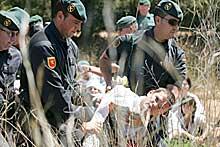 Similarly to what happened the last two years, a group of inspectors crossed the wire fences of the future headquarter of the NATO Response Force in Valencia (Spain) in order to claim for its closure and return to the population, inspite of a strong deployment of police forces.  14 de mayo de 2005 Civil inspectors entered the base near Valencia but inmediately were expelled by the police Similarly to what happened the last two years, a group of inspectors crossed the wire fences of the future headquarter of the NATO Response Force in order to claim for its closure and return to the population, inspite of a strong deployment of police forces. More than one hundred civil inspectors left on saturday morning the village of Bétera to undertake the walk to the headquarter of the NATOs Rapid Reaction Force, which lies at a distance of 4 km. The participants were equipped with white coats, signs (showing slogans as "CLOSE DOWN THE BASE", "RETURN THE BASE", "NATO OUT"), prismatics, cameras, questionnaires and, as a special feature this year, with magnifying glasses in order to carry out their investigation. During the march of about one hour the group has been accompanied by a strong deployment of the Guardia Civil (military security forces), that consisted in a large number of police vehicles, motorbikes, dozens of officers and dogs. Not to forget a helicopter that several times passed closely to the ground and even landed on a roundabout near the headquarter, only some meters away from the march. Some officers intended to impede the advance of the group on the road leading to the base, arguing that they were "waiting for instructions", but the inspectores passed them quite easily. About 12’30 a.m. the march, that at this time had a lenght of about 100m, crossed the road and started walking directly beside the headquarter's fence. Some minutes later they reached the place where the entrance was to happen, near to the fences of the main installations of the base. Inspite of the presence of the riot police inside and outside the base and of the helicopter just a few meters above the inspectors' heads, the fourteen inspectors in charge of carrying out the inspection of the interior of the base, managed to cross the wire fences and entered the military site. During these moments it could be seen that the officers were acting with more brutality that in former editions of this action, threatening the participants with their truncheons, pushing them violently and even grabbing their necks. The persons that had entered the base did not manage to advance in direction of the main installations on accounts of the expeditiuos conduct of the riot police, that after surrounding and concentrating the group on a small spot forced them to sit down using in several cases painful immovilizing techniques. The officers that were present in the interior of the military site refused to answer any of the questions of the questionnaires that the inspectors carried with them and that treated topics such as the presence of weapons of mass destruction, uranium ammunition and cluster bombs at the NATO base. In a few minutes, and even without sufficient time to take their arab tea, the fourteen inspectors were identified and expelled, carrying them one by one over a hole in the fence to the outside. None of them was arrested. In the exterior, the other inspectors sang and threw flowers in honor of the potential victims of this offensive military installation. As we were told by the inspectors team, "once again the secretism and the opacity of the military affairs has been visible: As we could not carry out the intended mission of observation we will return next year. Nevertheless we were able to confirm that it is an installation that produces and stores violence, insecurity and fear, and that has the capacity to project them to any place in the world. As we don't want to be part of a global war in that everyone of us is a potential victim, we reclaim the dismantling of these and the other military installations. In the meanwhile we will do everything possible to obstruct and impede their functioning by means of disobedience and nonviolent action. For now we leave quite pleased, because our action supposed a hindrance to the normal functioning of this war installation for quite a while". The proposal that they make with their action is obvious: "immediate closure of the installation, return of 100% of the land to the village of Bétera for social and ecologic use, as an extension of the Natural Parc "La Sierra Calderona" and as a center of environmental observation and protection (using of the buildings and the military helicopters)". Photos: