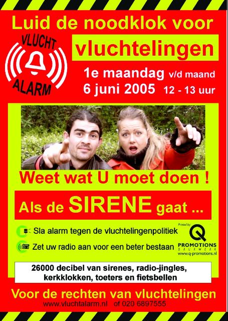ACTIE VLUCHTALARM, maandag 6 juni, 12 uur.  De verontwaardiging over het inhumane vluchtelingenbeleid gonst weer door Nederland. Op het moment dat Spanje 700.000 (!) ongedocumenteerden een verblijfsvergunning geeft, blijft het Nederlandse beleid hardvochtig en in strijd met internationale verdragen en basisrechten. Daarom roepen vluchtelingenorganisaties met de steun van platform Keer het Tij op tot de Actie Vluchtalarm! Op maandag 6 juni klinken om 12 uur alle alarmsirenes in Nederland. Normaal houdt dit na korte tijd op, maar wij laten door middel van lokale en landelijke radio en kerkklokken het alarm een stuk langer doorklinken om een humaner beleid te eisen, waaronder een generaal pardon voor de groep van 26.000 vluchtelingen die voor 1 april 2001 asiel hebben aangevraagd. Meer dan 20 lokale groepen hebben laten weten dat ze in hun stad een aktie gaan organiseren, waaronder in ieder geval Amsterdam, Arnhem, Eindhoven, Leeuwarden, Maastricht, Nijmegen en Wageningen. Organiseer je ook wat in jouw woonplaats? Geef het dan door aan vluchtalarm@keerhettij.nl Posters/pamfletten bestellen. Doe ook mee! Er zijn A2-posters en A5-flyers beschikbaar. Je kunt deze bestellen door onderstaand strookje terug te sturen. ++++++++++++ANTWOORDSTROOKJE++++++++++++++++++ A, ik/wij bestel(len) materiaal: - Posters (A2): ....... (minimaal 10) 0,50 per 10 posters - Flyers (A5): ....... (minimaal 50) 0,50 per 50 flyers Naam: Organisatie: Adres: Postcode + Plaats: Telefoon: Financiele bijdragen over te maken op giro 4787693 t.n.v. Platform Keer het Tij o.v.v. "bijdrage Vluchtalarm". Mocht een financiele bijdrage voor de posters echt een onoverkomelijk probleem zijn. Laat het dan weten, dan zoeken we daarvoor een oplossing. GRAAG TERUGSTUREN AAN vluchtalarm@keerhettij.nl +++++++++++++++++++++++++++++++++++++++++++++++++++ Deze aktie wordt tot nu toe ondersteund door: ASKV/Steunkomite Vluchtelingen, Nederland Bekent Kleur, Onbegrensd, Platform Keer het Tij, Prime, UNITED, Van Harte Pardon en Werkgroep Vluchtelingen Vrij. Zie http://www.vluchtalarm.nl voor een update. E-Mail: vluchtalarm@keerhettij.nl Website: http://www.vluchtalarm.nl |