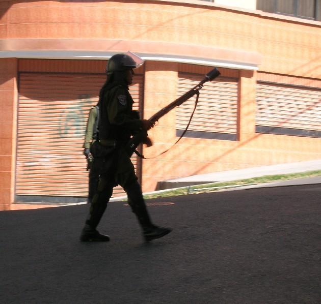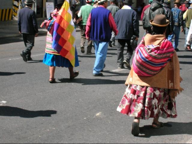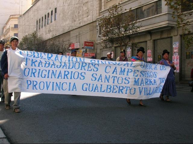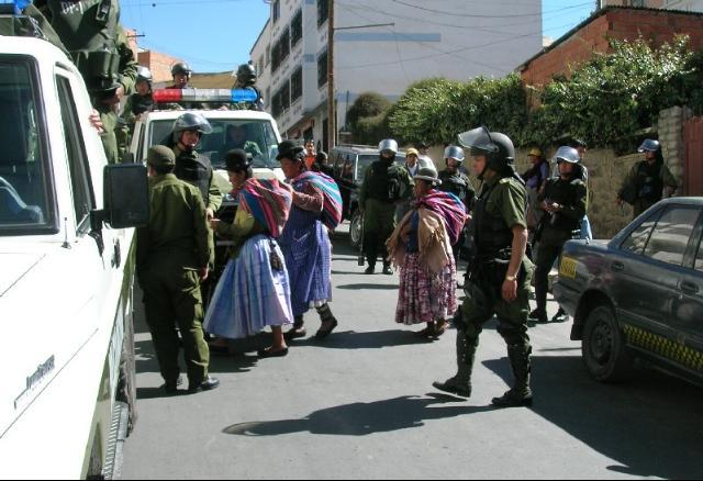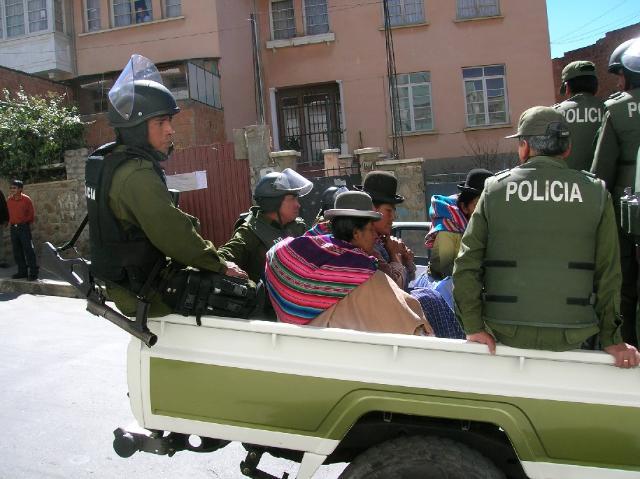 Vandaag, zaterdag 4 juni , bleef het in het centrum van La Paz behoorlijk rustig. Ondanks de onzekerheid van de situatie, blijven bepaalde sectoren met kracht doorzetten. Rond twaalven ´s middags zetten de boerenbewegingen uit de provincies, na twee weken dovemansoren van de Mesa’regering opnieuw een march in. De demonstratie zakte af naar La Plaza del Estudiante en vandaaruit gingen ze verder tot aan het kantoor van de Federatie van de boerenbewegingen. Onderweg was er even sprake van agressie tegenover de marktkramers, aangezien zij zich niet bij de mars aansloten. Wanneer de demo uiteindelijk het kantoor bereikte, was de mobiele politie ter plaatse (GES), die de demonstratie met geweerschoten en traangas naar boven driven. Er zijn tenminste drie campesinas gearresteerd. Verder passeerde ook een combi met nog 4 gearresteerden, waarvan we niet zeker weten of zij ook deelnemers van de mars waren.