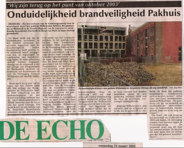 Krantenartikel uit weekblad De Echo van 16 maart jl. over brandveiligheid van pakhuizen naast (het illegaal ontruimde) Pakhuis Afrika. Cohen en de zijnen hebben hier wederom fouten gemaakt.