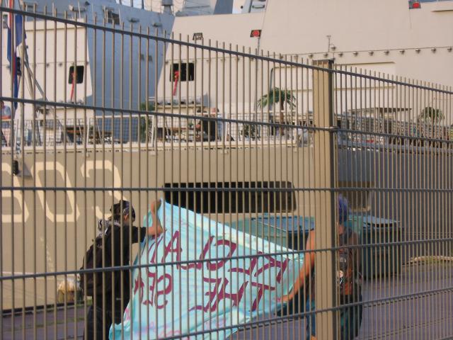Na sluiting van de UDT wapenbeurs in de RAI zijn een zeemeermin en een piraat doorgegaan naar het marineschip Hr Ms Tromp, om ook bij hen de zee terug te eisen van al het oorlogstuig. Met een spandoek wisten ze door te dringen tot de zwaar beveiligde kade voor Pakhuis Afrika. Ze wisten zelfs aan boord te komen van het marineschip en hielden enige tijd de loopbrug bezet met het spandoek.  Reclaim The Sea from boys war toys  marine personeel kijkt toe hoe de politie werkt  gearresteerd en afgevoerd.... Het marineschip, wat er vermoedelijk lag in het kader van de UDT wapenbeurs in de RAI, had inmiddels gezelschap gekregen van een ander marineschip. De vredesaktivisten hebben enige tijd op de loopbrug doorgebracht maar zijn daar onder dreiging van een brandslang weer vanaf gewandeld, om hun protest op de kade voort te zetten. Na vrij lange tijd kwam de politie, die hen onmiddellijk arresteerde wegens het bevinden op verboden terrein. Tijdens de overbrenging naar het buro kwamen ze nog in een zeer spannend evenement terecht, nadat het bericht 'assistentie collega' werd geroepen. De agenten begonnen helemaal te flippen omdat ze erg graag hun collega's wilden helpen en namen voor lief dat de zeemeermin en de piraat nog bij hun achterin zaten. Het voorstel van de zeemeermin om hen dan maar vrij te laten werd in hun adrenalinekick helaas niet gehoord. En zo kwamen twee vredesaktivisten geheel ongevraagd in een vrij heftige situatie terecht, waarbij gelukkig net geen kogels om hun oren vlogen. Maar waarbij de buurt wel uitliep om naar het spectakel te kijken en andere buurtbewoners zo aardig waren om het verkeer te gaan regelen, wat een chaos werd omdat de politieauto (en iets later in meervoud) behoorlijk fout geparkeerd stond. Eenmaal aangekomen op het buro hoefden de twee aktievoerders niet zo heel lang te blijven, en werden ze na 1,5 - 2 uur vrijgelaten met een bekeuring wegens het bevinden op verboden terrein. De aktivisten zullen de boete laten voorkomen voor de rechter. Bij vrijlating wilde een agent ook nog het bewuste spandoek in beslag nemen, omdat de tekst kwetsend zou zijn voor de marine. Er stond op (zie ook foto's) 'Reclaim The Sea from boys war toys'.... Nadat er geen afstand werd gedaan van het spandoek en de agent weer in overleg moest met zijn meerdere over wat hij nu moest doen, kreeg hij te horen dat hij het spandoek weer moest terug geven aan de aktivisten. Het blijft lastig dat getreiter van die agenten....! |