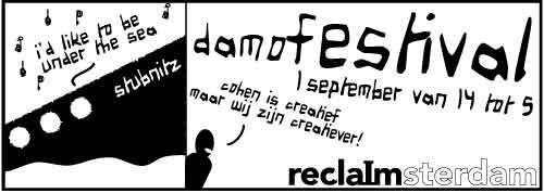 Het Damoclash festival dat eerder zes maal in Pakhuis Afrika gehouden werd en eenmaal noodgedwongen in het Vondelpark, zal ter gelegenheid van het nieuwe culturele en collegejaar donderdag 1 september a.s. gehouden worden op het voormalige vissersschip MS Stubnitz bij het NDSM-terrein. Persbericht woensdag 24 augustus 2005 Achtste Damoclash festival donderdag 1 september 2005 op MS Stubnitz Het Damoclash festival dat eerder zes maal in Pakhuis Afrika gehouden werd en eenmaal noodgedwongen in het Vondelpark, zal ter gelegenheid van het nieuwe culturele en collegejaar donderdag 1 september a.s. gehouden worden op het voormalige vissersschip MS Stubnitz bij het NDSM-terrein. Damoclash is een regelmatig terugkerend cultuurfestival dat haar publiek vindt onder jonge kunstenaars en studenten. Het festival, dat van ’s middags 14:00 tot in de vroege ochtenduren zal duren, zal opnieuw aan bekende en minderbekende jonge kunstenaars, muzikanten en dichters de kans geven zich te laten zien en horen. Verder zijn er dj's en vj’s en worden er op de avond creatieve gerechten geserveerd. Er is een grote zaal voor bands, een kleinere zaal voor literaire voordrachten en akoestische muziek. Ook zijn er workshops ‘seksuele voorlichting voor gevorderden’ en kruidengeneeskunde, een lezing over de toenemende onzekerheid op de woningmarkt en een debat met wetenschappers en politici over de commercialisering van het hoger onderwijs. Damoclash is een samenwerkingsverband van een dertigtal Amsterdamse jongeren en (kunst)studenten. Zij is niet links of rechts, wel progressief. Zij wil iets veranderen in de stad. Mensen bij elkaar brengen. En vooral de kunst weer op de straat brengen. Galerieën, musea, concert en podiumzalen, zijn vaak te elitair of te duur. Kunst is voor iedereen en door iedereen. Maar een plek waar op een vrije en laagdrempelige manier publiek en kunstenaars samen iets nieuws kunnen creëren was er nog niet. Mede daarom is het succes van Damoclash zo groot: het trok voor de ontruiming van Pakhuis Afrika maandelijks honderden bezoekers. Op de avonden kunnen de bezoekers volop artistieke en maatschappelijk relevante ideeën uitwisselen. Er is sprake van een grote interactie tussen kunstenaars onderling en kunstenaars en publiek. Blijkbaar is er in Amsterdam onder jongeren een enorme behoefte aan een dergelijke plek. Damoclash is dan ook blij dat zij eenmalig een geschikte vervangende locatie gevonden heeft voor haar festival. Zij beraad zich op toekomstige mogelijkheden. Het doel van Damoclash blijft een alternatief te bieden voor het commerciële en op de consument gerichte uitgaansleven. Zij wil een bloeiende stad creëren waarin mensen worden uitgedaagd te creëren, samen te werken en ideeën te ontwikkelen. Zie voor de actuele programmering van het aankomende festival: http://www.damoclash.nl/forum/viewtopic.php?t=755 Contact: