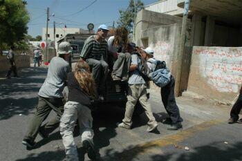 Fri, 26 Aug 2005 12:56:07 -0000 A Peaceful Demonstration in Bil'in Village, Palestine, was attacked today by the Israeli military, using rubber bullets, tear gas and sound grenades. There were 4 wounded including a 61 year old peace activist from Los Angeles, USA, who was injured by a tear gas cannister, and required hospital treatment, her condition is not considered to be critical. Two Israeli activists and a Canadian have been detained. Villagers, International Volunteers from ISM and the IWPS and Israelis, gathered today in Bil'in to protest against the construction of the Apartheid Wall. This will rob Bil'in of 52% of their agricultural land this land has been earmarked for settlement expansion. Focussing on the IDF's increasing use of violence to protect illegal settlements, and using the slogan "Guns Kill Peace" around 200 protesters approached the site of the Wall and confronted the soldiers. Israeli activists attempted to engage the soldiers in dialogue, asking soldiers why they were protecting illegal settlements and pointing out that these were an obstacle to peace. Soldiers responded by throwing sound grenades and opening fire, with tear gas and rubber bullets;these were being fired directly at the crowd against all protocols. The demonstration had been completely peaceful up to this point with community leaders ensuring that there was no stone throwing or provocation. Soldiers later openned fire on crowds of Palestinian children who had been dancing and singing during the protest. The demonstrations in Bil'in have been met with increasing violence by the IDF. The villagers see the non-violent protests as a vital means of channelling anger and frustration at the increase in human-rights abuses and land-grabs. An ISM spokesperson stated. "The increasing use of force by the IDF when confronting a peaceful demonstrations, shows Sharon's determination to force through his illegal settlement policy in the West Bank, and quell any dissenting voices by force if necessary. It also suggests that democracy and human rights are only to be enjoyed by Israeli citizens and therefore he does not see the Palestinians as human beings." there will be footage of the demonstraton later today on the ISM website at www.palsolidarity.org For more information phone the ISM office on: 00972 2971824