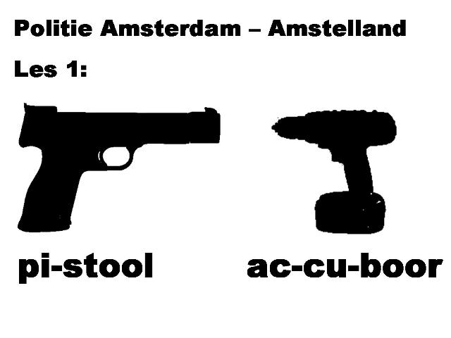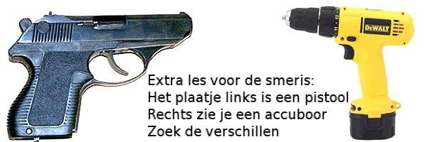 Grote paniek vanwege accuboor  De Amsterdamse politie heeft in grote paniek de drukke Prins Hendrikkade afgezet om met groot machtsvertoon de bewoners van een huis onder schot gehouden en geblinddoekt af te voeren. Er was namelijk een man met een accuboor gesignaleerd. En dit is in de tijd van terreur en bedreigingen uiteraard niet te tolereren. Zeker niet als de klusser in kwestie in een kraakpand woont. Het voorval klinkt bijna grappig, maar dat is het natuurlijk niet. De boodschap van het 'bevoegd gezag' zal waarschijnlijk zijn dat de halve stad in de file staat omdat een paar activisten met al hun politieke leuzen een klimaat schappen dat van kwaad tot erger kan leiden. Waar de ene dag een spandoek ophangt kan de volgende dag wel eens tot geweld overgaan. Een kippige agent vindt een accuboor dan al snel reden om groot alarm te slaan. Maar als men zich gewoon zou hebben gedragen en in een net huis zonder teksten erop zou wonen was dit allemaal niet gebeurd. Niet alleen eigen schuld dikke bult, maar de rest van de stad moet ook nog eens lijden onder dit stelletje provocateurs. Even de link leggen met het gat in het raam van Rita Verdonks werkkamer. Dagen lang wordt met veel tam tam de hele Nederlandse bevolking voorgehouden dat er een geschoten is op de kamer van Rita. Er is een gevaarlijk klimaat en alle protesten tegen Verdonk en haar beleid dragen hiertoe bij. Het wordt als reden opgegeven om de vrijheid van meningsuiting in te perken en overal kritische spandoeken van gevels te verwijderen. En dan blijkt het toch geen kogel te zijn geweest maar een bijziende vogel die zich te pletter heeft gevlogen tegen het raam. Of misschien iets nog onschuldigers. Komt er dan een excuus van de overheid voor de hetze die ze zelf hierover is gestart? Natuurlijk niet. Dit 'butsincident' wordt professioneel uitgebuit om activisten zwart te maken en de aandacht af te leiden van het werkelijke probleem; het beleid van Rita Verdonk; Mensen die niets anders hebben gedaan dan het ontvluchten van de ellende in hun geboorteland worden vervolgt, onveilig weggeborgen en met hun vertrouwelijke dossiers erbij weer overhandigd aan de regimes waarvor ze gevlucht waren. En onze arme minister loopt inmiddels rond met een kogelvrije vest. Ze zal wel stemmen hopen te winnen met deze ge-ensceneerde slachtofferrol. Maar goed, het kan natuurlijk ook dat er vanuit Amsterdam met een boor een gat in Rita's raam is geschoten. |