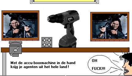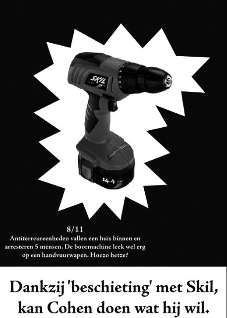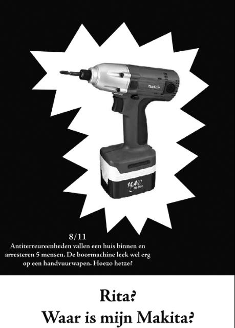 Wat zijn die posters van jullie goed gemaakt! Hier nog een poster. Deze mag ook vrij worden gebruikt. misschien kunnen jullie ook zoiets nog gebruiken: Met een accu-boormachine van Skil,wordt het in je buurt eng stil. Door het gebruik van accu-boormachine van Milwaukee,spoelt de overheid burger-rechten door de plee. Stop repressie en censuur! Solidaire groeten. | | Poster Rita reisbureau | Lars - 15.11.2005 14:04