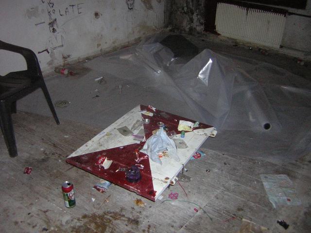 De stijgers voor de Vismarkt staan er werkelijk alleen voor reclame-doeleinden. Er gebeurd niets met dit pand. Binnen staat zelfs nog een krakerstafeltje met wat lege bierblikjes, precies zoals het is achter gelaten. | | herkraak? | idem - 22.11.2005 16:02