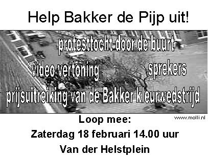 Zaterdag 18 februari organiseren de krakers en huurders van de Bakker-blokken samen een protesttocht door de buurt om aandacht vragen voor de situatie in de Bakker-blokken. De huurders van deze panden, gelegen rond de Henrick de Keijserstraat, zijn al jaren in conflict met speculant G.W. Bakker. Bakker wil de huurders hun woning uit zetten om de huidige 60 sociale huurwoningen tot 34 luxe koopappartementen om te bouwen. Niet alle huurders kunnen of willen vertrekken. Ter ondersteuning van de huurders heeft kraakgroep de Pijp in februari 2004 zeven etages in de Bakker-blokken gekraakt.