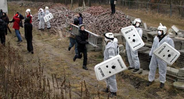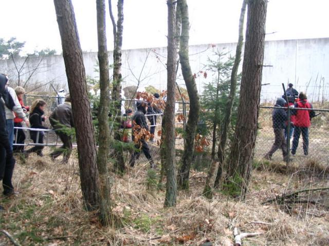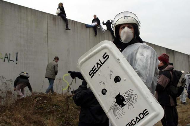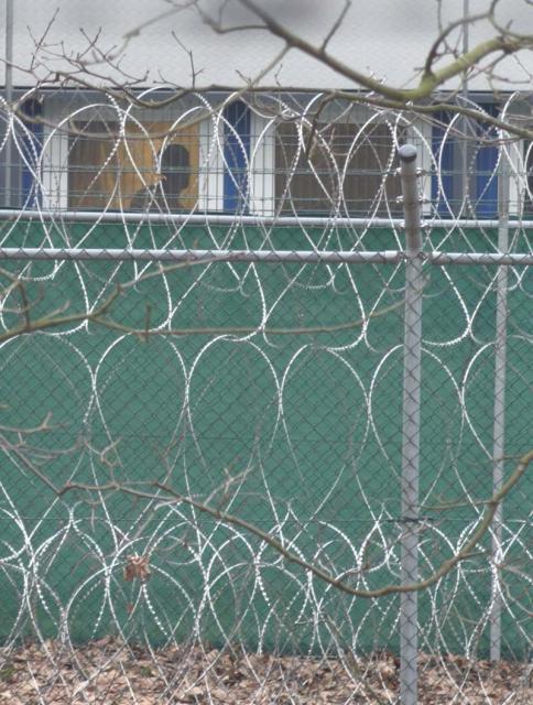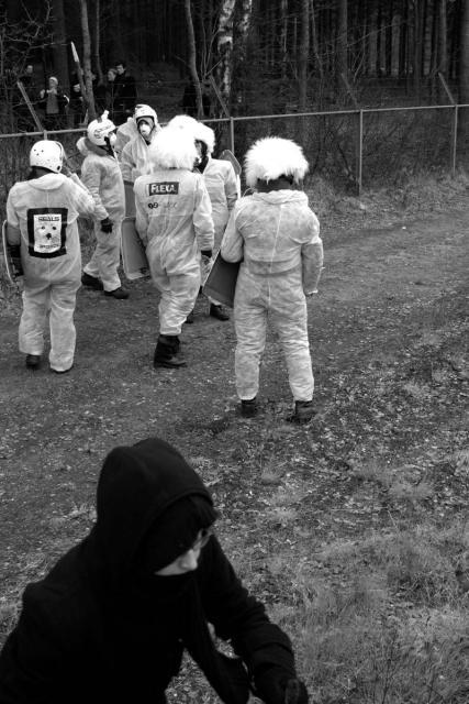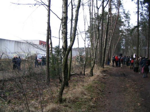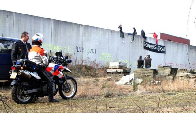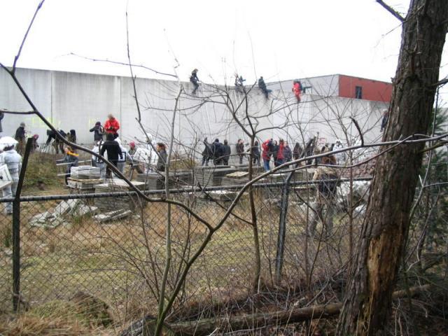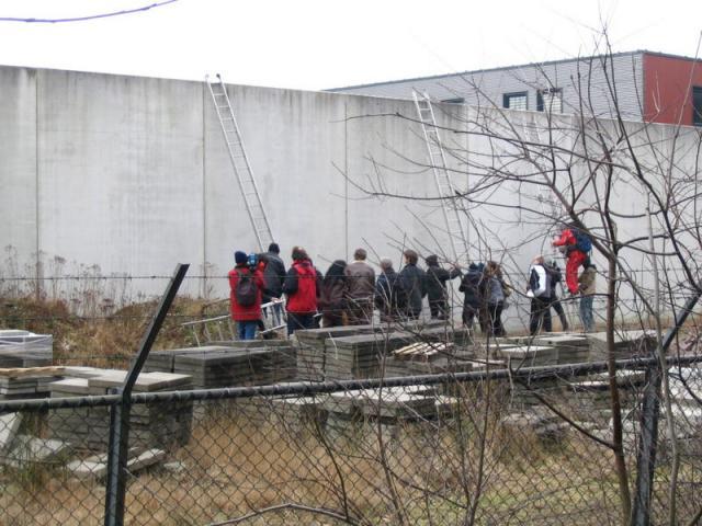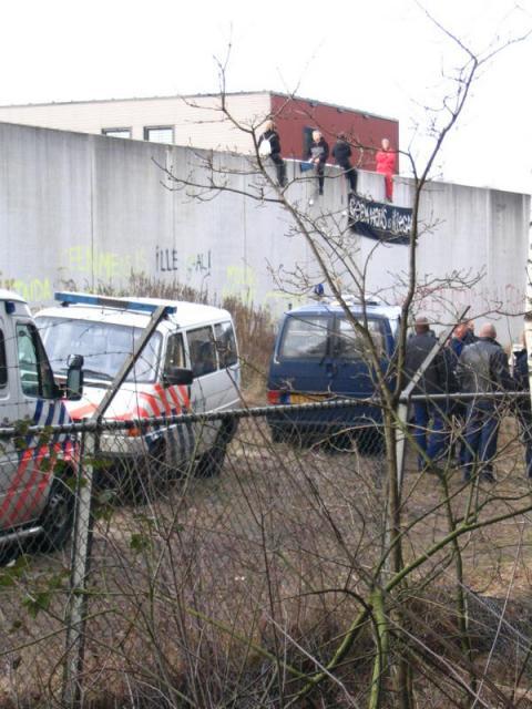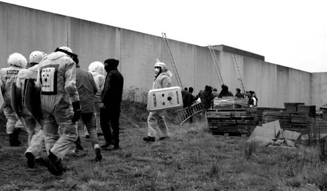 Er zitten vier mensen op de muur van het detentiecentrum, de muur is aan de boszijde beklad met leuzen. Er wordt nu een omtrekkende beweging gemaakt om ook met andere delen van het detentiecentrum contact te krijgen.