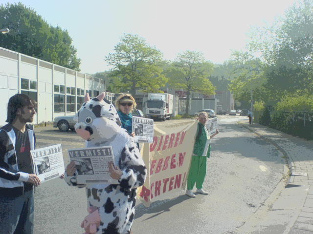 Moederkoe en haar dierenvrienden laten zich niet kisten: kalfje moet terug komen vóór moederdag! Vandaag hebben vrijwilligers van de dierenrechtenorganisatie EDEV – Een DIER Een VRIEND – samen met een heuse moederkoe, ter gelegenheid van moederdag aangeklopt bij het registratiebedrijf voor kalfjes en koeien: NRS (Wassenaarweg 20, 6843 NW, www.nrs.nl) in Arnhem. EDEV’s moederkoe zocht haar kalfje, dat direct na de geboorte ontvoerd is. De dierenvrienden hielpen haar door luid met een megafoon hun onvrede te uiten en met een spandoek (met de tekst ‘Dieren Hebben rechten’) aan mensen duidelijk te maken hoe dieronvriendelijk, ziek en liefdeloos de vlees-, zuivel- en bio-industrie zijn. Het scheiden van moeder en kind, vaak direct na geboorte, is uitermate wreed. Legio zijn ook de verhalen van koeien die nadat hun kinderen zijn weggehaald dagenlang radeloos loeien of zelfs uitbreken op zoek naar hun verdwenen kind. “Moederdag is een goede dag om eens stil te staan bij wat we de dieren in de voedsel-industrie aandoen. Bij miljoenen en miljoenen dierenmoeders worden op wrede wijze de kinderen afgenomen, hetgeen een traumatische ervaring is voor deze moeders en hun kroost. Dieren kunnen net als wij voelen, en ook depressief of radeloos (of gelukkig) zijn. Dieren hebben rechten en verdienen beter dan uitgebuit te worden.” aldus Geoffrey Deckers, voorzitter van EDEV. “Gelukkig stappen steeds meer mensen over op een diervriendelijke leefwijze, dus zonder dode dieren te eten of dieren te (laten) misbruiken.” Niet alleen in de zuivelindustrie worden kinderen op brute wijze afgenomen; ook op andere plaatsen in de bio-industrie wordt hun kroost ontvoerd en gemarteld tot aan de dood. Zo worden biggetjes en kuikentjes naar mesterijen gebracht waar zij, net als de kalfjes, op wrede manieren verminkt worden om vervolgens na een ellendig en kort leventje bij het slachthuis te worden afgeleverd. Miljarden baby’s worden vrijwel direct na de geboorte afgeslacht, bijvoorbeeld haantjes die levend door een vermaler gaan of vergast danwel verstikt worden. Onlangs nog zijn ter viering van het Paasfeest talloze 'zuiglammeren' (in de leeftijd van 6 tot 10 weken) bij hun moeders weggenomen en omgebracht. EDEV is een snel groeiende en actieve organisatie voor de bescherming van de rechten van dieren. De werkwijze van EDEV kenmerkt zich door het in de publiciteit brengen van dierenmishandeling en deze op alle mogelijke legale wijzen te bestrijden. EDEV voert hiertoe geweldloze campagnes en acties. Daarnaast geeft EDEV voorlichting aan het publiek en is continu in gesprek met het politieke bedrijf om zo de doelstellingen onder de aandacht van politici en beleidsmakers te brengen. EDEV acht zich daarbij niet gebonden aan enige politieke partij, kleur, persoon of ideologische overtuiging. E-Mail: campagnes@edev.nl Website: http://www.edev.nl |
