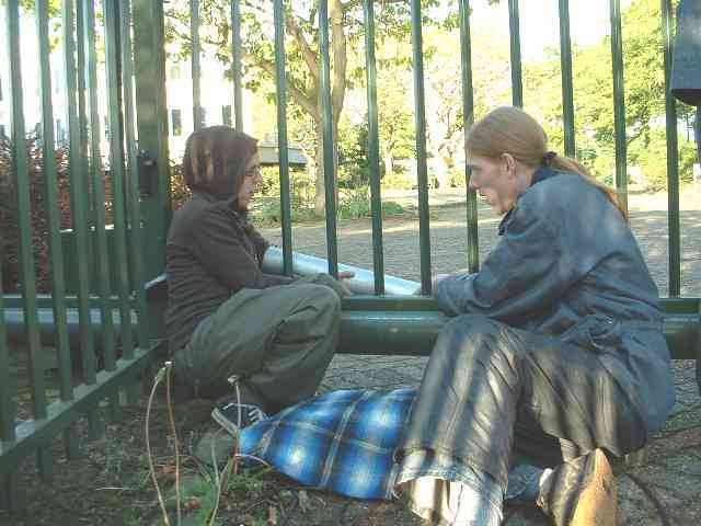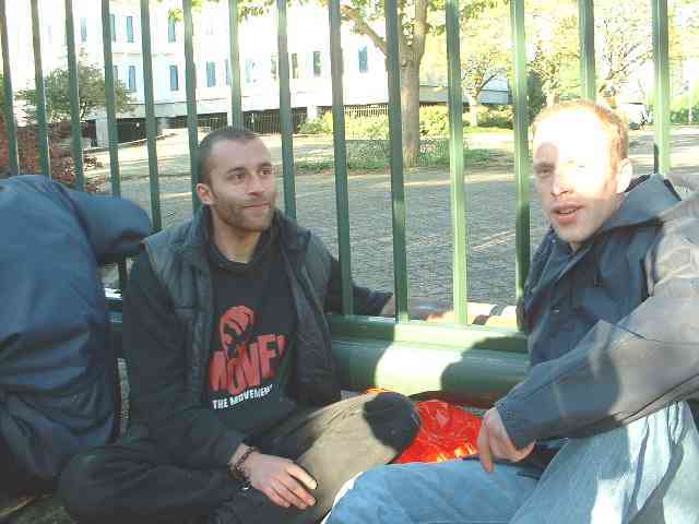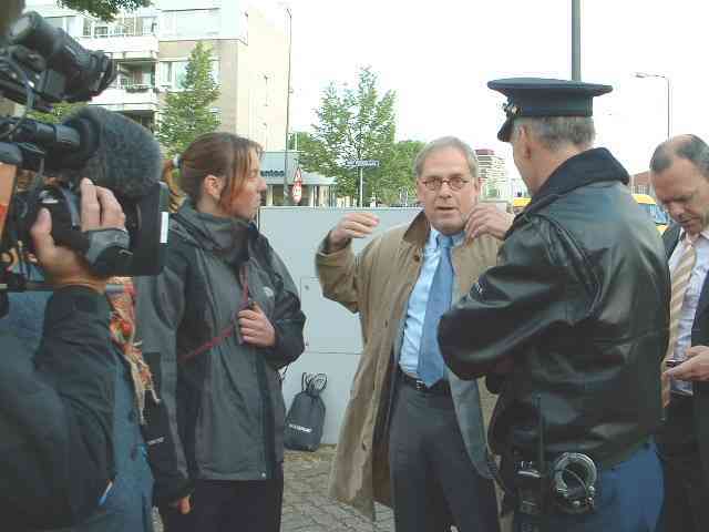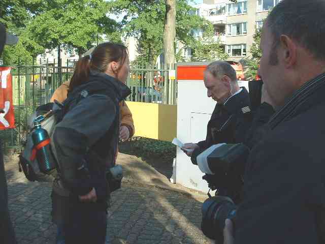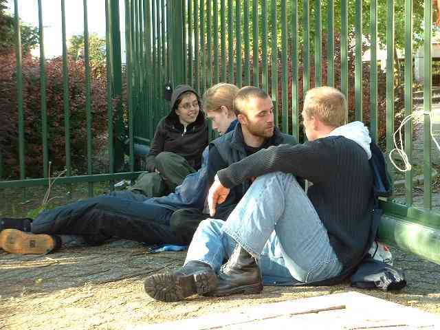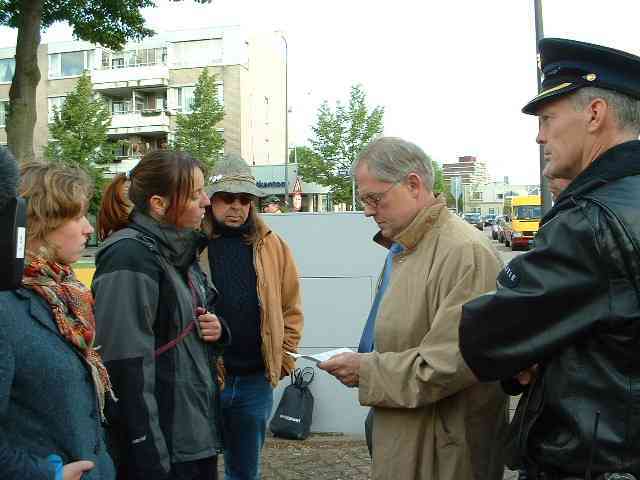 Theo Goosens (directeur ENCI) kwam de activisten vertellen dat de juridische en procedurele situatie anders is dan het lijkt, dat de ENCI ook enorm begaan is met het lot van de natuur en nog meer van zulke verhalen.... Maar ingaan op de eis om te stoppen met de vernieling van de natuur op de St. Pietersberg kon hij helaas niet. Hij is dus vanuit Maastricht naar Den Bosch komen rijden om dit verhaal te vertellen.....en hij kon gelijk nog mooi even de aanwezige journalisten te woord staan. De actie gaat nog dus steeds verder. Ondertussen hebben medewerkers een gaat in het hekwerk gemaakt, waardoor ze naar binnen en naar buiten kunnen gaan. Maar auto's e.d komen er nog steeds niet in. De politie lijkt niet in te gaan willen grijpen. De sfeer is nog steeds goed en het zonnetje schijnt... E-Mail: 2006(at)groenfront.nl Website: http://www.groenfront.nl | | Update 15:25 | VVGF! - 30.05.2006 15:22