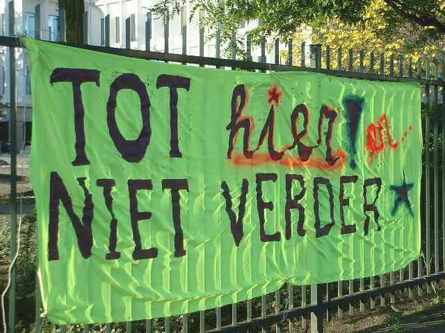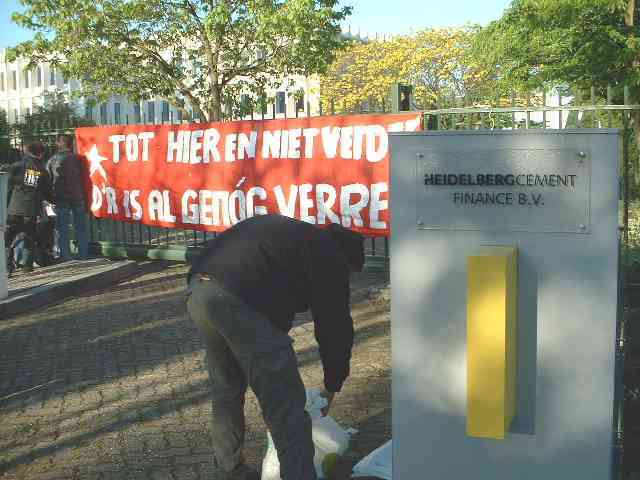 Persbericht: GroenFront!-actie bij ENCI-kantoor geslaagd Den Bosch – GroenFront! heeft vandaag 9 uur lang de toegangspoort van het hoofdkantoor van ENCI (Eerste Nederlandse Cement Industrie) in Den Bosch geblokkeerd. Aanleiding voor deze blokkade was de voorgenomen extra bomenkap en de verdere afgraving van de St. Pietersberg. Op 20 maart j.l. had de ENCI al 1,5 ha bomen gekapt, dit terwijl er nog allerlei juridische procedures liepen. GroenFront! eiste van de ENCI dat ze zouden stoppen met verdere afgravingen en bomenkap. ENCI-directeur Theo Goosens is – vanwege de blokkade-actie – halsoverkop vanuit Maastricht naar Den Bosch afgereisd om met de activisten te kunnen praten. Hier heeft hij belooft dat “er voorlopig geen bomen meer gekapt gaan worden”, maar over de afgravingen kon hij echter geen beloftes doen. Het lijkt of de ENCI hiermee een concessie heeft gedaan aan de inwoners van Limburg en GroenFront!, maar niets is helaas minder waar. Aangezien de ENCI op 20 maart al 1,5 ha gekapt had, hoeven ze dat 'voorlopig' niet meer te doen. “De ENCI probeert je hiermee blij te maken met een dooie mus”, aldus GroenFront!-activist Anja. Toch kijkt GroenFront! terug op een geslaagde actie. “Het feit dat de directeur van de ENCI halsoverkop 100 km gaat afleggen, geeft wel aan hoe bang de ENCI is voor kritiek” legt Anja uit,“ en als de ENCI goed om zou gaan met de natuur, hoeven ze helemaal niet bang te zijn voor kritiek.” Vanmiddag om 16:30 heeft GroenFront! de blokkade-actie vrijwillig beindigd. “Hopelijk heeft de ENCI met deze eerste actie begrepen dat natuurvernietiging niet ongehinderd plaats kan vinden.” sluit GroenFront!-activist Anja haar verhaal af.GroenFront!-actie bij ENCI-kantoor geslaagd Den Bosch – GroenFront! heeft vandaag 9 uur lang de toegangspoort van het hoofdkantoor van ENCI (Eerste Nederlandse Cement Industrie) in Den Bosch geblokkeerd. Aanleiding voor deze blokkade was de voorgenomen extra bomenkap en de verdere afgraving van de St. Pietersberg. Op 20 maart j.l. had de ENCI al 1,5 ha bomen gekapt, dit terwijl er nog allerlei juridische procedures liepen. GroenFront! eiste van de ENCI dat ze zouden stoppen met verdere afgravingen en bomenkap. ENCI-directeur Theo Goosens is – vanwege de blokkade-actie – halsoverkop vanuit Maastricht naar Den Bosch afgereisd om met de activisten te kunnen praten. Hier heeft hij belooft dat “er voorlopig geen bomen meer gekapt gaan worden”, maar over de afgravingen kon hij echter geen beloftes doen. Het lijkt of de ENCI hiermee een concessie heeft gedaan aan de inwoners van Limburg en GroenFront!, maar niets is helaas minder waar. Aangezien de ENCI op 20 maart al 1,5 ha gekapt had, hoeven ze dat 'voorlopig' niet meer te doen. “De ENCI probeert je hiermee blij te maken met een dooie mus”, aldus GroenFront!-activist Anja. Toch kijkt GroenFront! terug op een geslaagde actie. “Het feit dat de directeur van de ENCI halsoverkop 100 km gaat afleggen, geeft wel aan hoe bang de ENCI is voor kritiek” legt Anja uit,“ en als de ENCI goed om zou gaan met de natuur, hoeven ze helemaal niet bang te zijn voor kritiek.” Vanmiddag om 16:30 heeft GroenFront! de blokkade-actie vrijwillig beindigd. “Hopelijk heeft de ENCI met deze eerste actie begrepen dat natuurvernietiging niet ongehinderd plaats kan vinden.” sluit GroenFront!-activist Anja haar verhaal af.