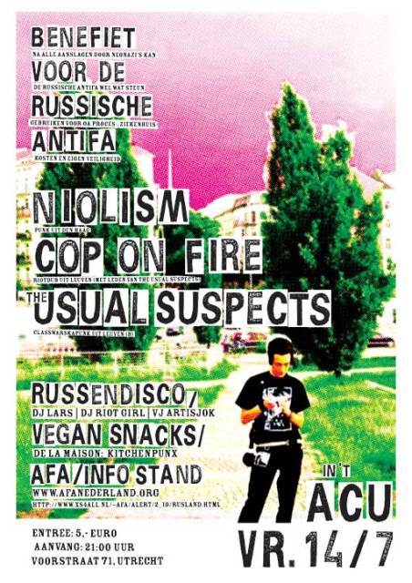 Op vrijdag 14 juli vind er een benefiet plaats in het ACU te Utrecht voor Russische activisten en in het bijzonder antifascisten. Hierbij kondigen we aan dat Usual Suspects ook komt spelen, zie ook poster. In ons vorige indymedia bericht kun je meer lezen over de feiten achter het benefiet:  http://www.indymedia.nl/nl/2006/07/37554.shtml.