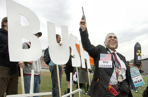 http://www.worldcantwait.net/ October 5: No Work. No School. Protest in the Streets. "...On October 5, people everywhere will walk out of school, take off work, and come to the downtowns & townsquares and set out from there, going through the streets and calling on many more to join us - making a powerful statement: "NO! THIS REGIME DOES NOT REPRESENT US! AND WE WILL DRIVE IT OUT!" ..." | | Foto's Breken met Bush | NCPN & CJB - 24.09.2006 03:05