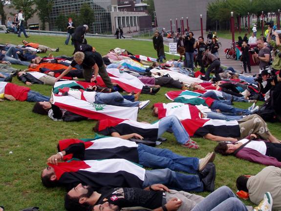 Zo’n 300 tot 400 mensen hebben zaterdagmiddag op de 'Internationale Protestdag Tegen De Oorlog' in Amsterdam op het Museumplein bij het Amerikaanse consulaat gedemonstreerd tegen de oorlogspolitiek van de VS. De actie met als motto “Breek met Bush” richtte zich tegen de bezettingspolitiek in Libanon en Palestina, alsmede tegen die in Afghanistan en Irak.  Na luchtalarm vielen de demonstranten symbolisch dood neer  Duidelijke symboliek van Bries en Co  Naast rode vlaggen en borden van NCPN en IS ontbraken Neerlands anarcho's niet  Ook de actieve betrokkenheid van Nederland bij de oorlogspolitiek van Bush werd gehekeld, van de troepenmissie in het Afghaanse Uruzgan tot het tolereren van de agressie tegen Libanon en de Palestijnen. De organisatie van de actie, de coalitie Stop Oorlog, wil onder meer dat Nederland de troepen uit Afghanistan terughaalt. Opgeroepen werd tot een onmiddellijk einde van de Nederlandse steun aan de VS en Israël. Een oproep daartoe is ondermeer ondertekend door Midden-Oostendeskundige Paul Aarts, Tweede Kamerleden Naima Azough en Godelieve van Heteren, publicist Mohammed Benzakour, acteur Peter Faber en rapper Ali B. Op het Museumplein werd de tekst 'Breek met Bush' getoond middels plakkaten en aandacht gevraagd voor de 'bloedige gevolgen' van de 'War on terror'. Verschillende deelnemers legden een link met de schandelijke gevangenispraktijken die sindsdien gebruikelijk zijn geworden. Tot de sprekers behoorde oud-Kamerlid Mohammed Rabae van GroenLinks. Hij stelde dat na Hitler Bush de grootste idioot ter wereld is die de meeste wapens ter wereld tot zijn beschikking heeft. Hoogtepunt van de manifestatie was dat na het klinken van een luchtalarm de demonstranten symbolisch dood neer vielen, waarna zij enkele minuten in het gras bleven liggen. De actie eindigde met een minuut stilte voor de slachtoffers van de oorlog. De actie verliep verder zonder problemen. De actie was een initiatief van Stop Oorlog, een coalitie van verschillende organisaties waaronder het Palestina Komittee en de Internationale Socialisten. Na de succesvolle 'Luid de Noodklok!' betoging op 22 juli in Amsterdam, waar duizenden mensen demonstreerden tegen de oorlog in Libanon, was de tweede manifestatie van de nieuwe coalitie dus beduidend minder bezocht. Eind oktober houdt de organisatie in Amsterdam een grote conferentie met diverse debatten en sprekers uit binnen- en buitenland!