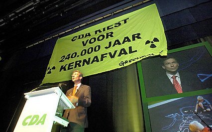 Terwijl CDA-fractievoorzitter Maxime Verhagen een toespraak afstak waarin hij vooral de PvdA ervan langs gaf, slaagden activisten van Greenpeace erin onder luid applaus van de zaal een spandoek met de tekst 'Het CDA kiest voor 240.000 jaar kernafval' op te hangen.  Verhagen merkte weliswaar op dat er iets achter hem te gebeuren stond, maar ging onverstoord door met zijn speech. Maar de aandacht van de zaal CDA-congresgangers was duidelijk weg. Achter de schermen probeerden mensen van de organisatie de activisten en het spandoek te bereiken, maar ze konden niet de juiste deuren openen. Een jonge activist zich als alpinist aan een touw afglijden. Na lang aandringen van onder meer partijvoorzitter Marja van Bijsterveldt kwam de jongeman naar beneden. CDA-leden deden op het congres tevergeefs een poging het kernenergiestandpunt van de partij terug te draaien. Op advies van het partijbestuur werd er gestemd vóór nieuwe kerncentrales. Het CDA vindt kernenergie noodzakelijk totdat we in de toekomst kunnen overstappen naar duurzame energie. De Energierevolutie van Greenpeace, een scenario doorgerekend door een gerenommeerd Duits instituut, bewijst echter dat kernenergie helemaal niet nodig is. Een nieuwe kerncentrale zou in 2016 klaar moeten zijn. "Het scenario laat zien dat in die tijd, door slim om te gaan met energie en schone energiebronnen te gebruiken, acht kerncentrales van het type Borssele voorkomen kunnen worden", aldus Greenpeace. Ook plaatst de milieuorganisatie grote vraagtekens bij de beschikbaarheid van voldoende uraniumbrandstof. Staatssecretaris Van Geel (CDA, VROM), presenteerde afgelopen week de voorwaarden voor de bouw van een tweede kerncentrale in Nederland. Uit de notitie van Van Geel blijkt dat hij het kernafvalprobleem op de lange baan schuift. Een kerncentrale moet de gebruikte splijtstof tot 2025 tijdelijk opslaan in de hoop dat er ooit een oplossing voor komt. Voor opslag van kernafval op de lange termijn durft Van Geel geen locatie aan te wijzen. Website: http://www.ravagedigitaal.org |