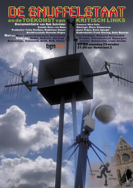 DE SNUFFELSTAAT EN DE TOEKOMST VAN KRITISCH LINKS Uitzending: 23 oktober 2006 Regie: Rob Schröder Productie: Ymke Kreiken In de jaren zeventig vond er een historische verandering plaats binnen de gelederen van kritisch links. Revolutionair links verloor terrein. Niemand geloofde meer in de revolutie. In plaats van partijgebonden groepen als Maoïsten, Leninisten en Marxisten ontstonden nieuwe activistische bewegingen die opkwamen voor vrouwenrechten, de homo's, dieren, het kraken en de Derde Wereld. Ze vochten tegen kernenergie en voor een beter milieu. Met succes bestreden tientallen actiegroepen sociale misstanden. Ze slaagden erin om een aantal wezenlijke veranderingen in de maatschappij door te voeren. Er kwamen geen kruisraketten, bont werd afkeurenswaardig, vrouwen kregen hun abortus en gelijke rechten, homo's mogen huwen en Zuid-Afrika werd verlost van het apartheidsregime. De BVD en later de AIVD hebben deze bewegingen steeds met grote belangstelling gevolgd en al of niet met succes geïnfiltreerd. En dat had een enorme weerslag op kritisch links. Het leidde tot paranoïde gedrag, sociale uitsluiting, versplintering en radicalisering. Na 11 september, de moord op Pim Fortuyn door dierenactivist Folkert van der G. en de moord op Theo van Gogh is de macht van de geheime diensten enorm uitgebreid. Wat is de toekomst van activistisch en kritisch links nu hun speelruimte nog kleiner wordt? Vorig jaar november werd Louis Sévèke in Nijmegen vermoord, afkomstig uit de kraakbeweging en actief onderzoeker naar de handel en wandel van BVD en AIVD. Niemand weet wie achter de moord zit, al zijn de speculaties niet van de lucht. Aan de hand van Sévèke's bevindingen en die van het bevriende onderzoeksbureau Jansen en Janssen kijken we terug naar het linkse verleden, het heden en de toekomst. Er wordt o.a.. gesproken met deelnemers aan "De Grootste Volksopstand van Nederland": de kraak van de Piersonstraat in Nijmegen,met de advocaat Prof. Ties Prakken over de verwikkelingen rond de RARA aanslagen, met Tweede Kamerlid voor Groen Links Wijnand Duyvendak over zijn actieverleden in Onkruit en met vertegenwoordigers van het Groenfront over de acties rond de Betuwelijn en het bos in Schinveld. | |