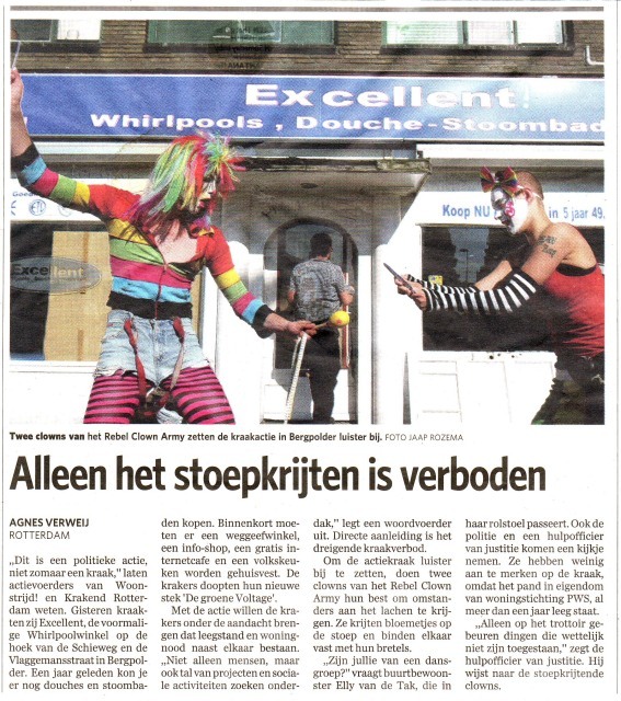 De open dag van woonstrijd on tour in Rotterdam!!!! In De Groene Voltage was vanmiddag om 15:00 een open dag voor de buurtbewoners en iedereen die een kijkje wou nemen. Het is erg gezellig geweest, er zijn buurtbewoners langsgeweest die allemaal erg positief reageerden, er is muziek gemaakt door een acoestisch bandje en een buurvrouw heeft allemaal spullen voor de weggeefwinkel langsgebracht. Het hele weekend is erg leuk geweest, er is in korte tijd veel gebeurt en het was supergezellig! Vrijdag was de kraak zelf, met 2 clowns, die tijdens het breekwerk en erna de politie en de nieuwsgierige mensen afgeleid hebben! Dit werkte heel goed en het was ook erg leuk om te zien van binnenuit het pand. Helaas besloot een agent dat ze niet mochten stoepkrijten, want dat is verboden....Oei oei, pas op voor de gevaarlijke krakers met stoepkrijt!!! Later is de politie nog 2 keer langsgeweest om te controleren en omdat er een melding van geluidsoverlast zou zijn geweest. Verder hebben we alleen maar hele positieve reacties gehad. Er heeft ook een stuk in het AD gesttan, zodra ik de link heb zal ik hem hier plaatsen.