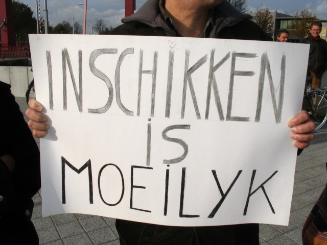 De NVB demonstreert in Middelburg tegen de bouw van een nieuwe moskee. De demonstratie loopt vanaf het station langs de stad over een provincieweg in de richting van het weiland waar de nieuwe moskee zal gebouwd worden.  Rond 13.00u kwamen tussen de 60 en 80 demonstranten aan op het station van Middelburg. Er is heel veel politie aanwezig, platte petten, politie te paard, politie op de fiets en heel veel ME. Alle wegen en kruisingen zijn afgezet om te voorkomen dat de demonstratie de stad in zou trekken. De inwoners van Middelburg zijn massaal uitgelopen om aapjes te kijken, vanaf de overkant van het kanaal staan ze te bekijken wat die eigenaardige lui daar wel niet komen doen, ze hebben er totaal geen affiniteit mee. Groepjes jongeren fietsen rond en bekijken het hele gedoe van op afstand. Het heeft allemaal echt iets van aapjes kijken. Rond 13.25u begon het groepje de route langs de rand van de stad om te lopen. Inmiddels zijn in het centrum de antiracisten aan het flyeren. De flyer is een uitnodiging om, na afloop van de racistendemo, gezellig een bezoek te brengen aan de huidige moskee, waar de Middelburgse bevolking een rondleiding zal krijgen en onthaald zal worden op thee en een hapje te eten. Om ongeveer 14.00u komt de demonstratie aan bij het eindpunt. Er komen steeds meer mensen aapjes kijken, maar uit hun houding is absoluut niet op te maken wat ze erover denken, ze kijken gewoon toe. Vannacht werd op straat ergens langs de route wel de slogan "nazi's rot op" gekalkt, naar die is door de gemeente nog voor aanvang van de demonstratie weer weggehaald. Op het eindpunt waren net ook twee spandoeken opgehangen, maar ook deze zijn weer verwijderd. Na het eind van de racistendemo lopen wel drie mensen met een bordje in een vorm van tegendemo. Rond 14.05u is de demo aangekomen bij het veldje waarop de moskee zal gebouwd worden, daar worden toespraken gehouden. De hele groep is ingesloten door politie, het terrein is afgezet met ME bussen. Aan de overkant van het kanaal staan ook de groep Middelburgers die de demo als toeschouwers aan het volgen was, die groep is inmiddels aangegroeid tot zo'n 300 mensen. Ook daar staat wat politie bij, maar alleen platte petten. Die zorgen ervoor dat deze groep op afstand blijft van de racisten door mensen die te dicht bij dreigen te komen terug te sturen. Rond 14.20u werd de demonstratie ontbonden, de racisten lopen onder politiebegeleiding weer richting station. Ze roepen "wij zijn het nationaal verzet". Er is nog steeds heel veel politie die met man en macht voorkomt dat de racisten de stad in trekken, een politie-agent wilde het volgende kwijt "ik vindt het verschrikkelijk, het is net of je ze faciliteert, zowel ik als mijn collega's hebben het er moeilijk mee, we willen ze zo snel als mogelijk weer de stad uit hebben." Iets voor 15.00u is de demonstratie weer aangekomen bij het station en daar officieel ontbonden. De demonstranten worden door de politie binnen een afzetting gehouden van waaruit ze in kleine groepjes gelost worden, om te voorkomen dat ze met zijn allen de stad in lopen. |